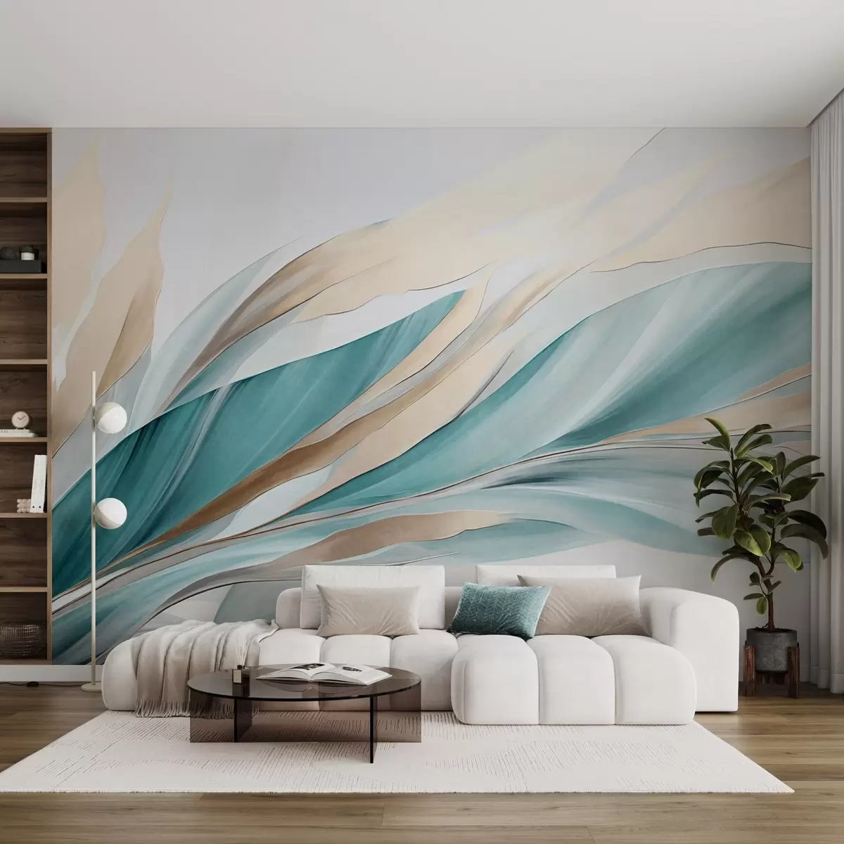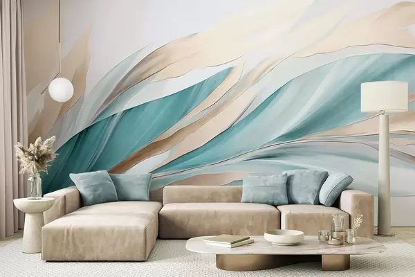 Τοιχογραφίες Αφηρημένα κυματιστά μοτίβα σε αποχρώσεις του γαλαζοπράσινου και του κίτρινου, με λεπτές γραμμές και σχήματα, σε λευκό φόντο, τέχνη με υφή Nr. w09585