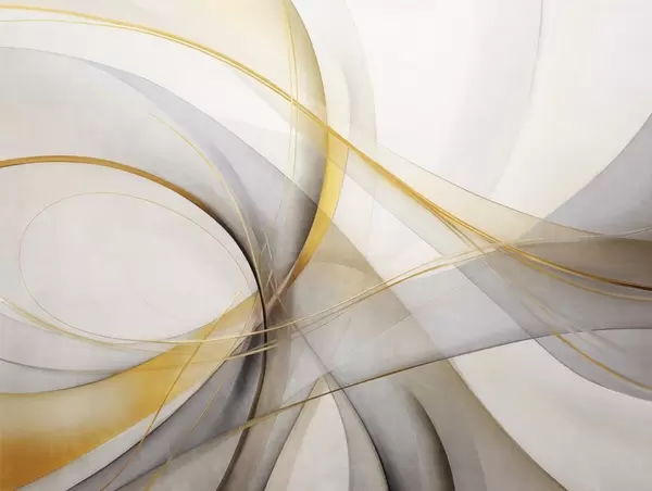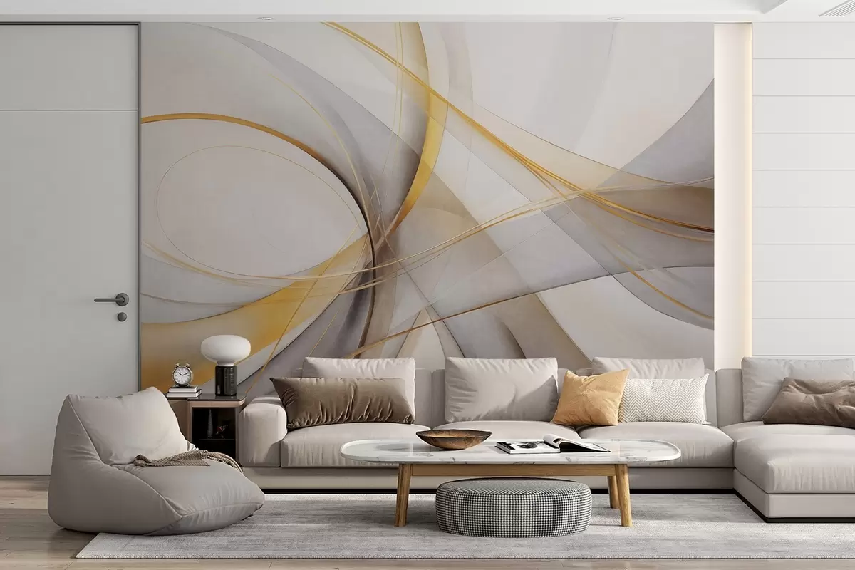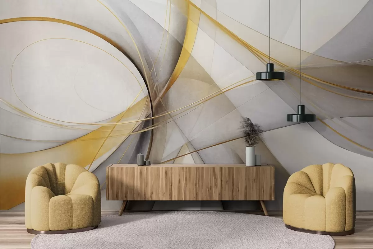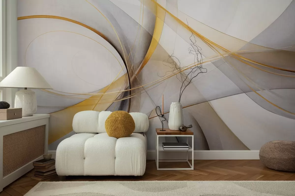 Τοιχογραφίες Αφηρημένες κυματιστές γραμμές σε κίτρινο και λευκό χρώμα σε γκρι φόντο, με αίσθηση κίνησης και βάθους, μοντέρνα τέχνη Nr. w09587