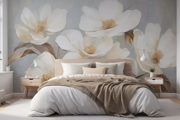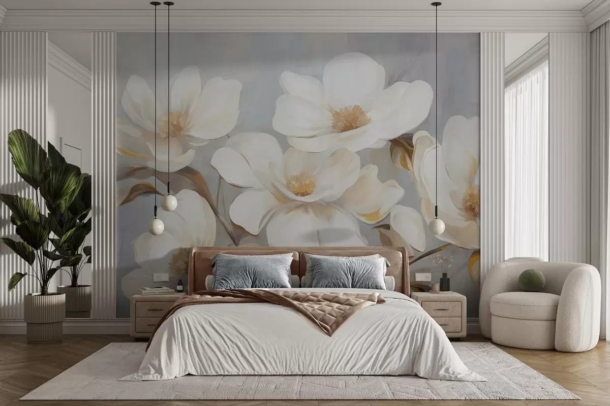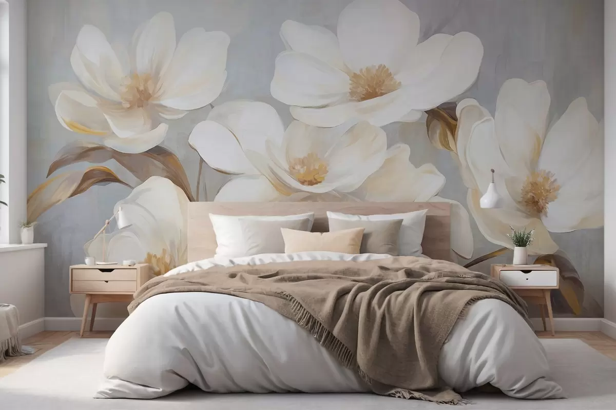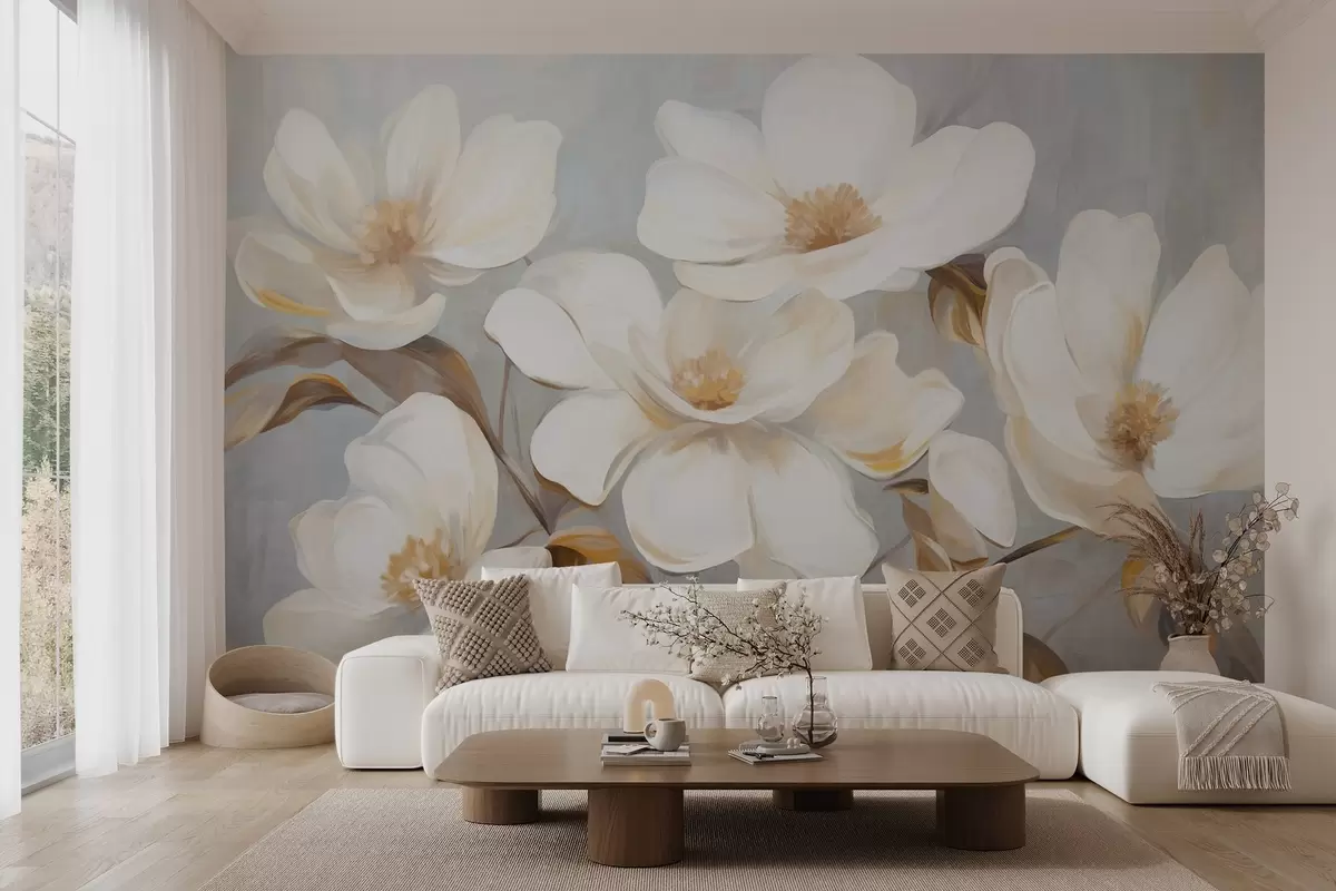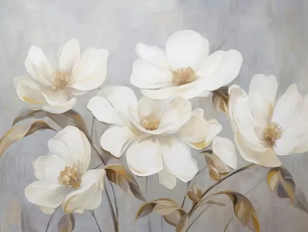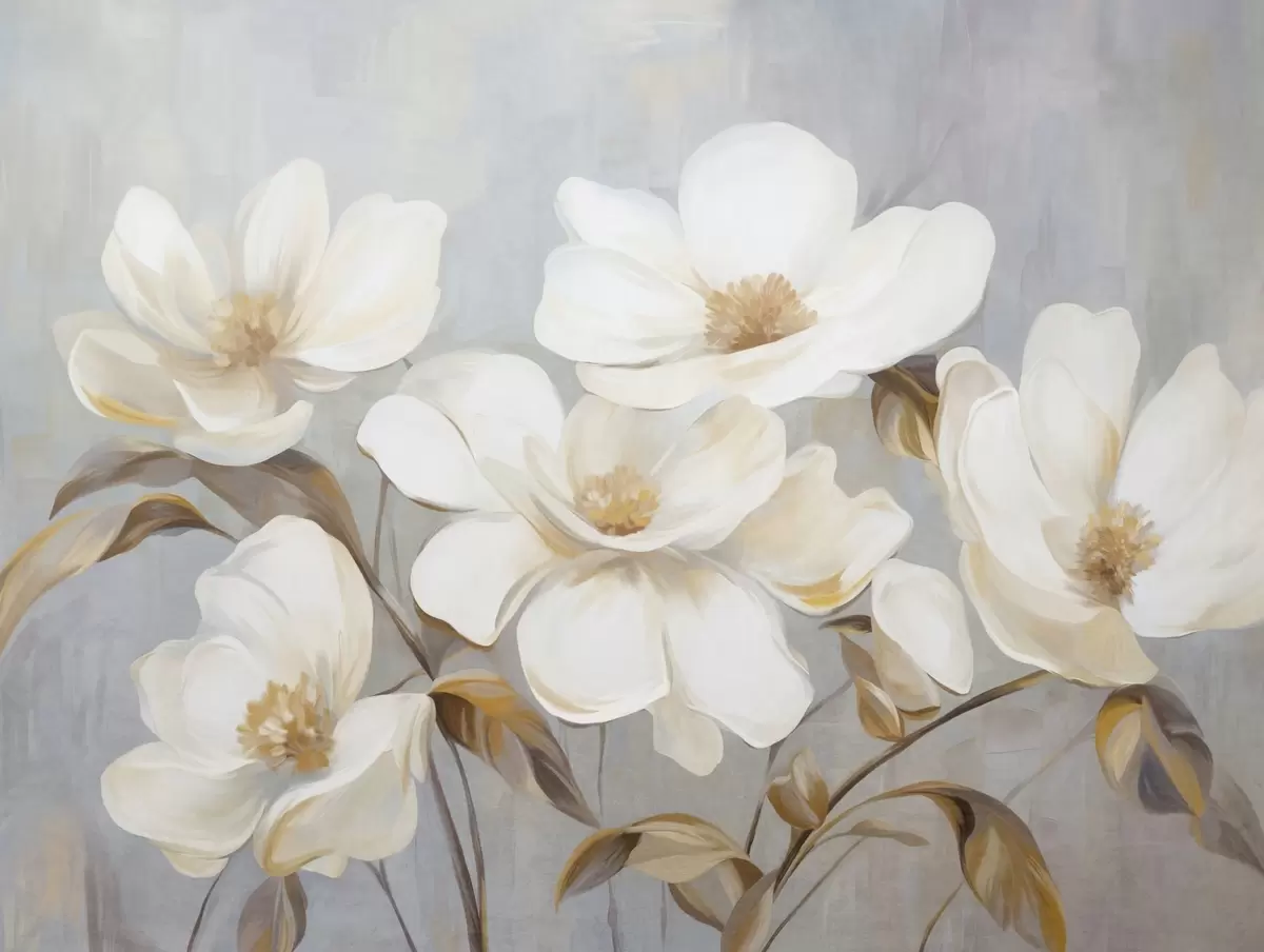 Τοιχογραφίες Ένα ανάγλυφο ζωγραφικό αντίγραφο αρκετών λευκών λουλουδιών μανόλιας σε φόντο απαλών παστέλ χρωμάτων. Nr. w09612