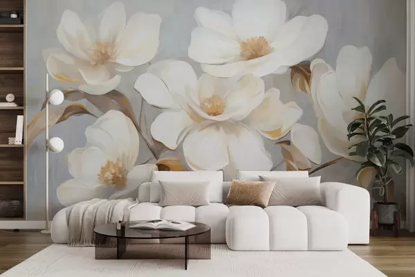 Τοιχογραφίες Ένα ανάγλυφο ζωγραφικό αντίγραφο αρκετών λευκών λουλουδιών μανόλιας σε φόντο απαλών παστέλ χρωμάτων. Nr. w09612