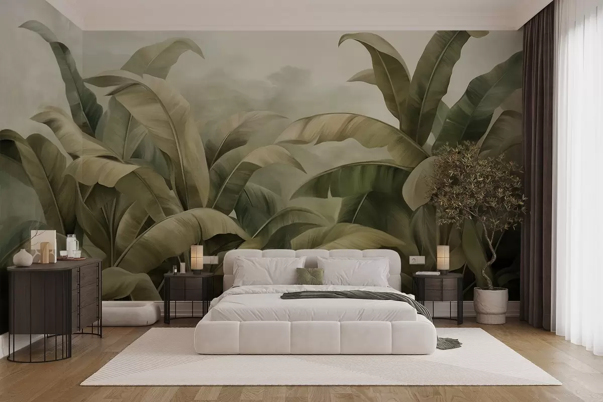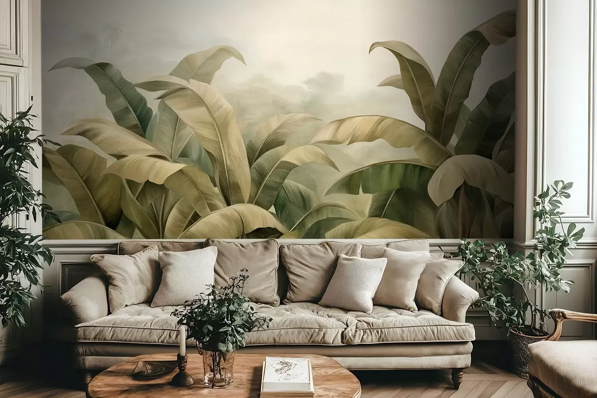 Τοιχογραφίες Πυκνό τοπίο ζούγκλας με υφή και μεγάλα φύλλα μπανανιάς σε απαλούς τόνους πράσινου και μπεζ Nr. w09613