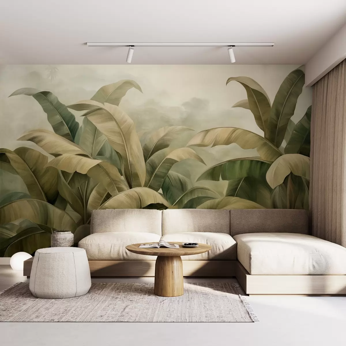Τοιχογραφίες Πυκνό τοπίο ζούγκλας με υφή και μεγάλα φύλλα μπανανιάς σε απαλούς τόνους πράσινου και μπεζ Nr. w09613