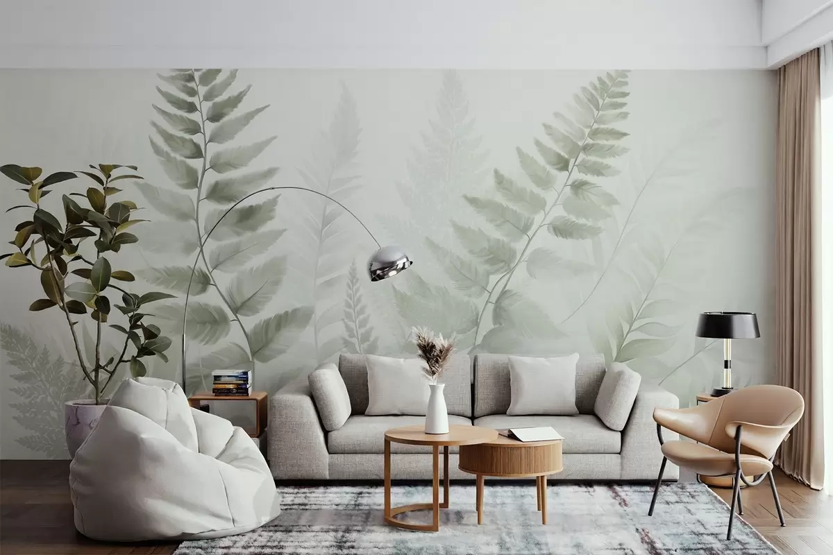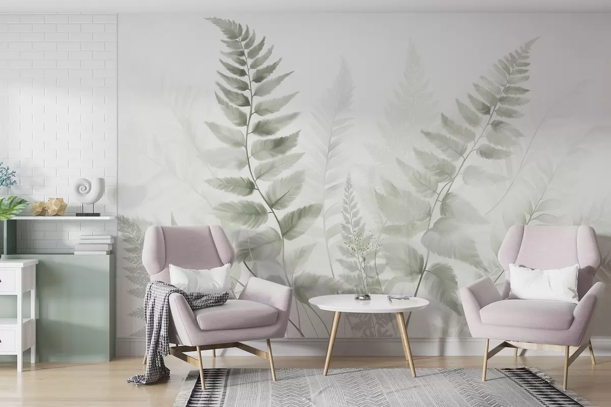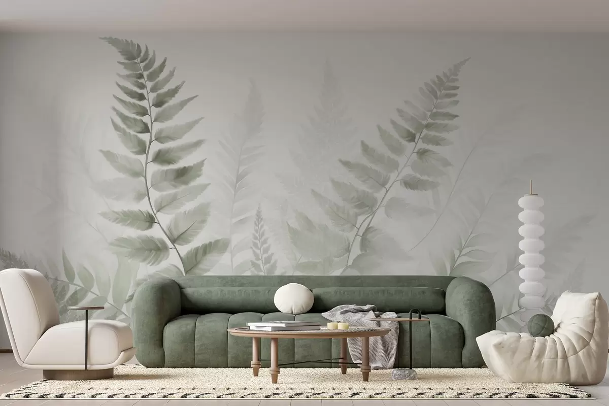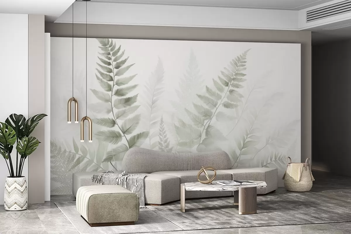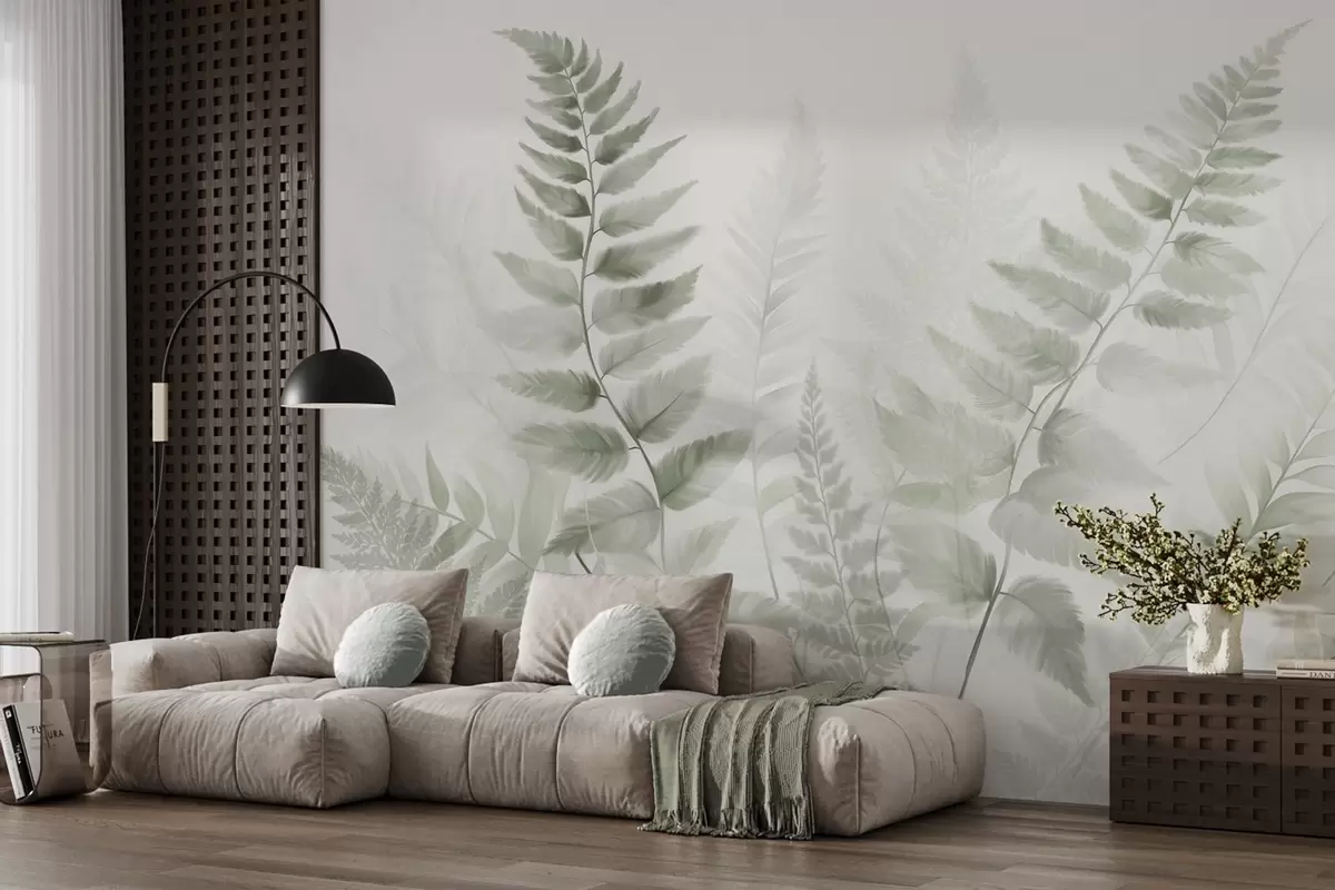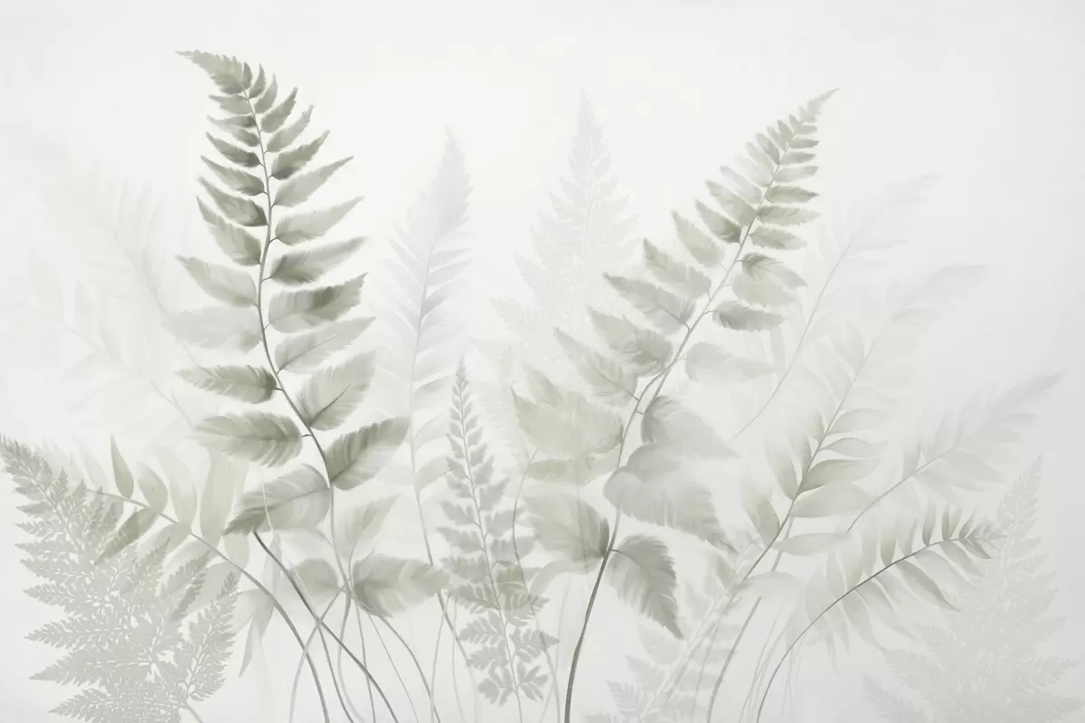 Τοιχογραφίες Αποξηραμένα φύλλα φτέρης με υφή σε διάφορες αποχρώσεις του πράσινου, με απαλό, ανοιχτό φόντο σε στυλ ακουαρέλας. Nr. w09615v1
