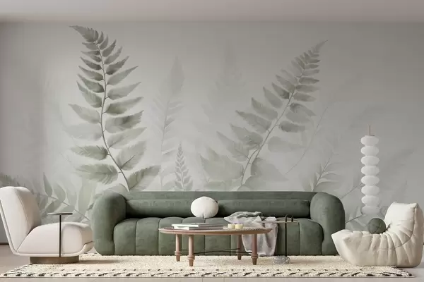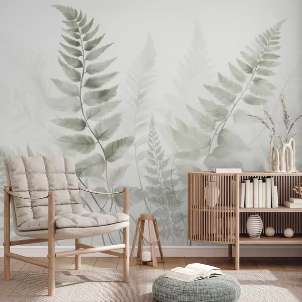 Τοιχογραφίες Αποξηραμένα φύλλα φτέρης με υφή σε διάφορες αποχρώσεις του πράσινου, με απαλό, ανοιχτό φόντο σε στυλ ακουαρέλας. Nr. w09615v1