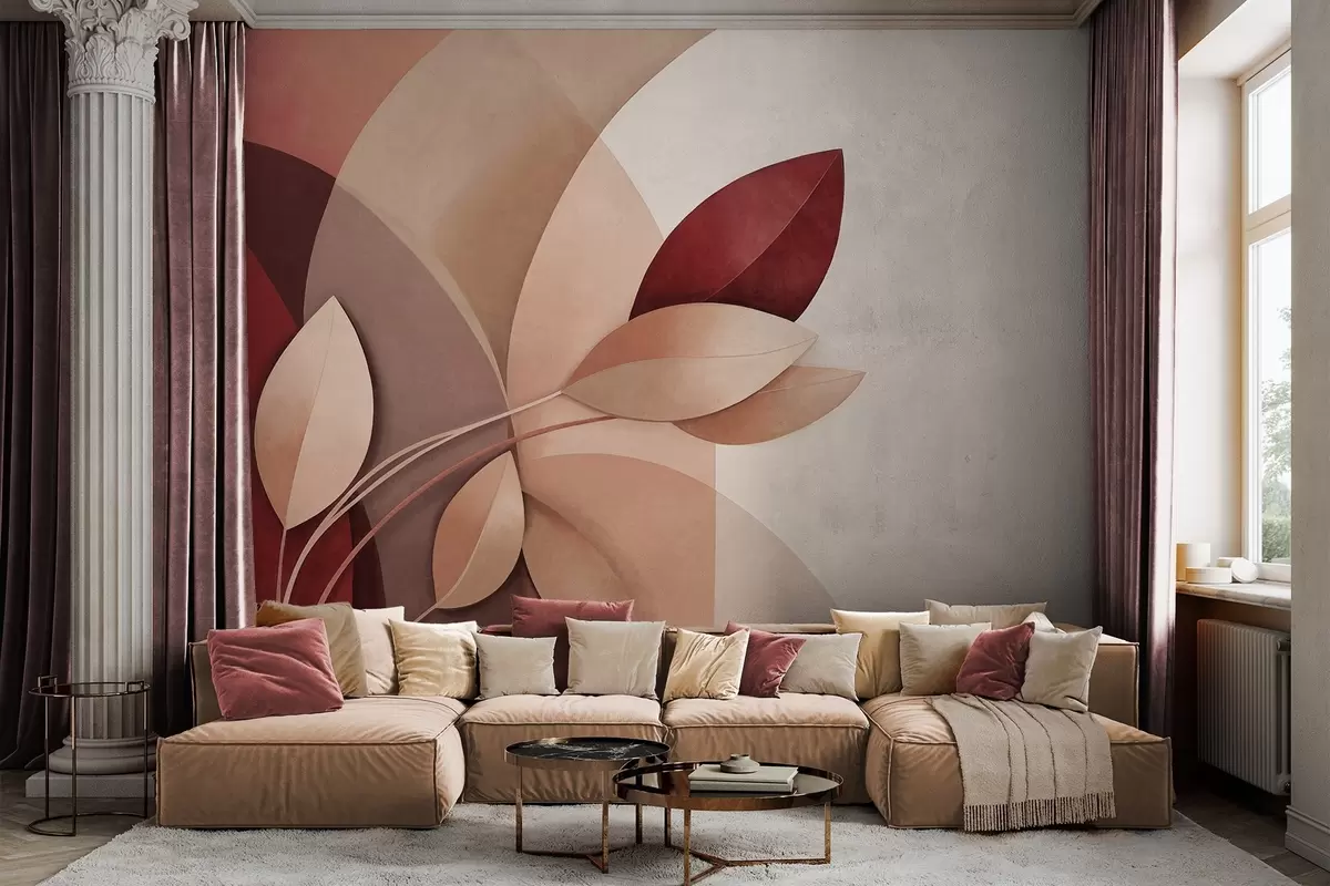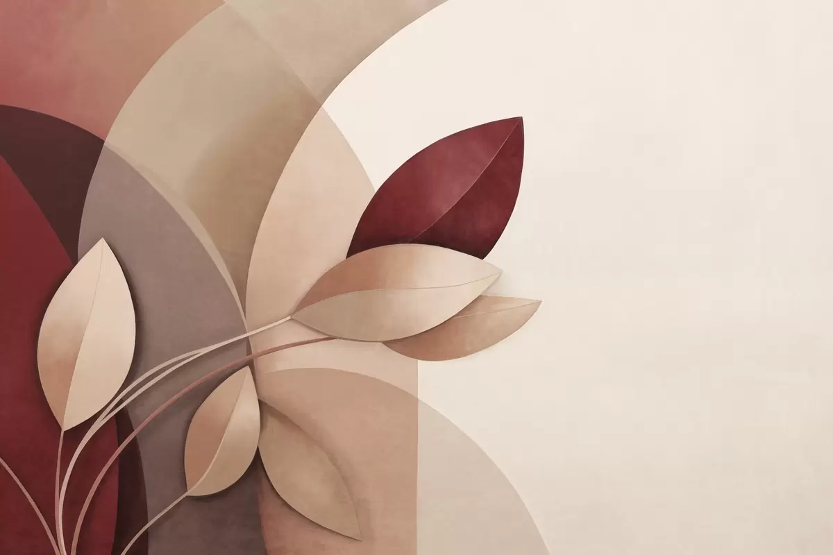 Τοιχογραφίες Αφηρημένο κλαδί με φύλλα σε αποχρώσεις του καφέ, του μπεζ και του κόκκινου, σε φόντο αφηρημένων σχημάτων Nr. w09618