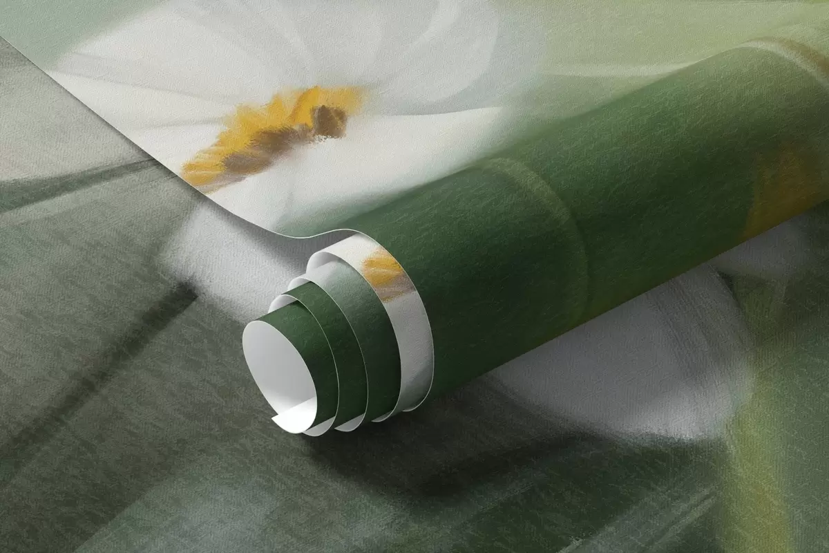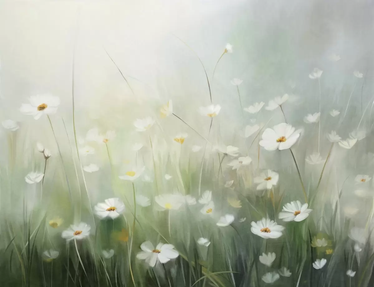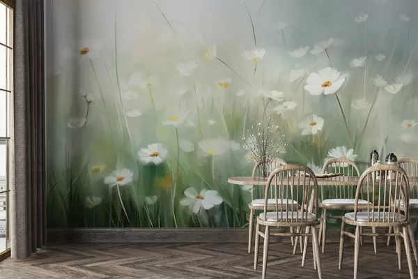 Τοιχογραφίες Αφηρημένο πεδίο με λευκές μαργαρίτες, πράσινο γρασίδι και απαλό, θολό φόντο σε ζωγραφικό στυλ Nr. w09619