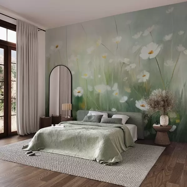 Τοιχογραφίες Αφηρημένο πεδίο με λευκές μαργαρίτες, πράσινο γρασίδι και απαλό, θολό φόντο σε ζωγραφικό στυλ Nr. w09619