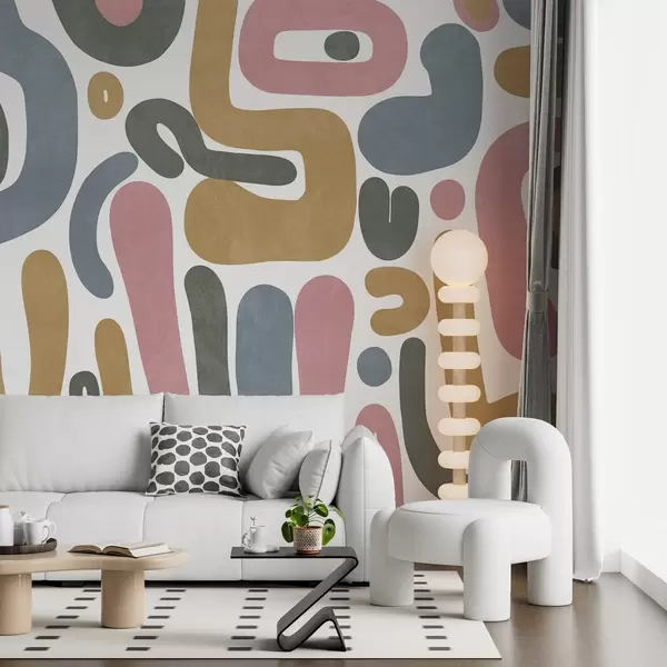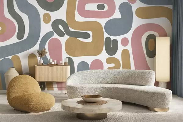Τοιχογραφίες Αφηρημένα σχήματα με υφή σε παστέλ ροζ, απαλό μπλε, κίτρινο μουστάρδα και γκρι σε λευκό φόντο μοντέρνα τέχνη Nr. w09620