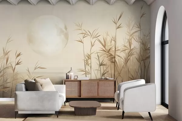 Τοιχογραφίες Τοπίο με υφή, ψηλά καλάμια, λίμνη και απαλό φεγγάρι σε ομιχλώδη ουρανό Nr. w09631