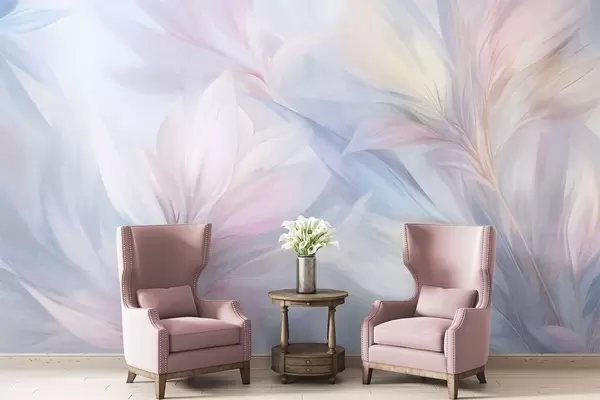 Τοιχογραφίες Απαλά, παστέλ χρώματα φύλλων και φτερών σε αποχρώσεις του ροζ, του μπλε και του κίτρινου, αφηρημένο και υφασμάτινο σχέδιο Nr. w09634