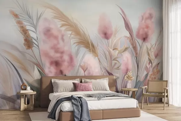 Τοιχογραφίες Ροζ και μπεζ χόρτα πάμπας και άλλα αποξηραμένα λουλούδια με ένα απαλό, ομιχλώδες ουρανό στο βάθος Nr. w09635