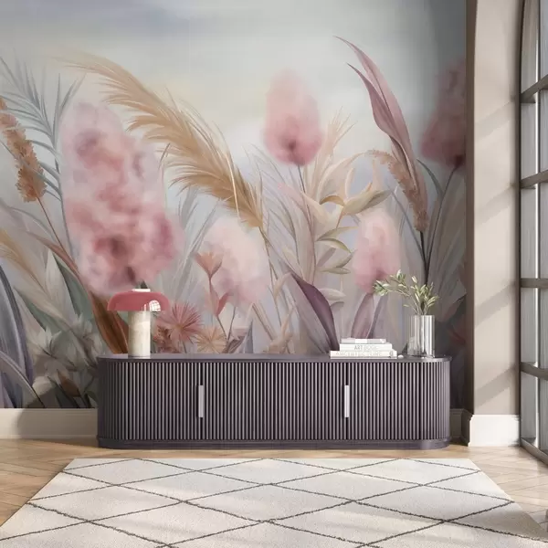 Τοιχογραφίες Ροζ και μπεζ χόρτα πάμπας και άλλα αποξηραμένα λουλούδια με ένα απαλό, ομιχλώδες ουρανό στο βάθος Nr. w09635