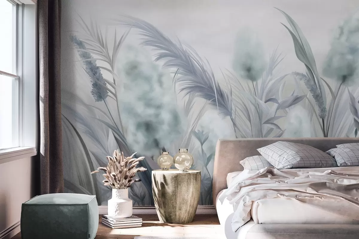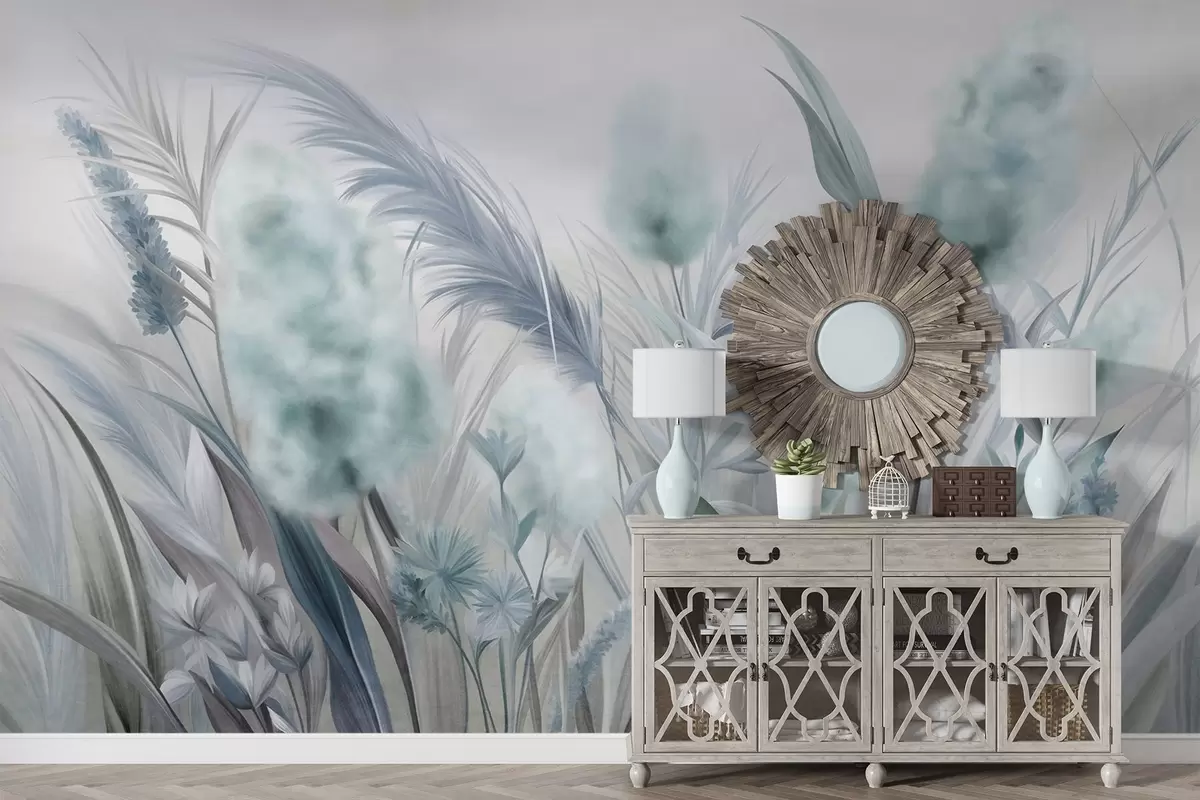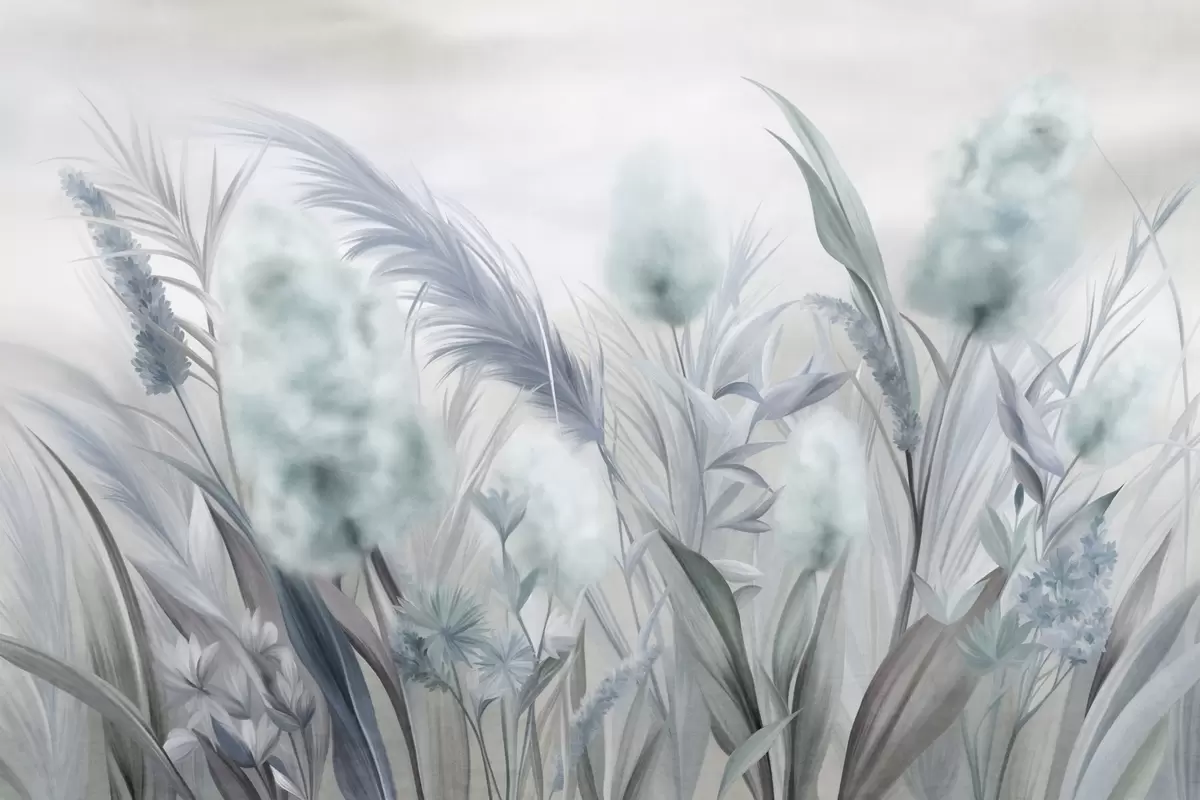 Τοιχογραφίες Μπλε και γκρι χόρτα πάμπας και άλλα αποξηραμένα λουλούδια με ένα απαλό, ομιχλώδες ουρανό στο βάθος Nr. w09635v1