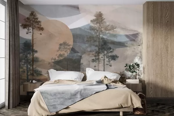 Τοιχογραφίες Ψηλά πεύκα σε ένα ήσυχο τοπίο με υφή, με αφηρημένα κυκλικά σχήματα και βουνά σε γήινους τόνους. Nr. w09636
