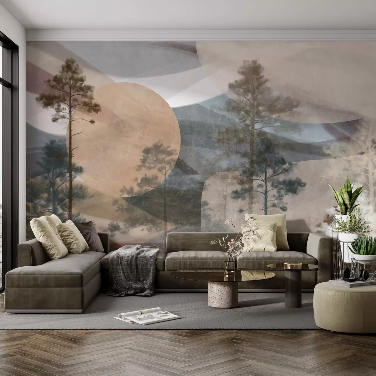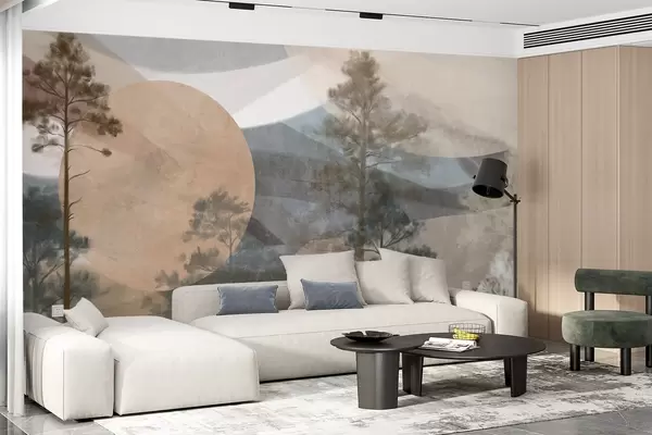 Τοιχογραφίες Ψηλά πεύκα σε ένα ήσυχο τοπίο με υφή, με αφηρημένα κυκλικά σχήματα και βουνά σε γήινους τόνους. Nr. w09636
