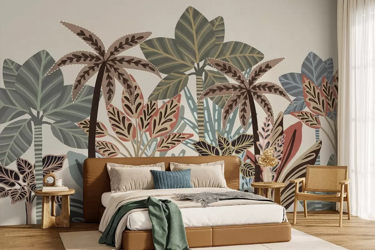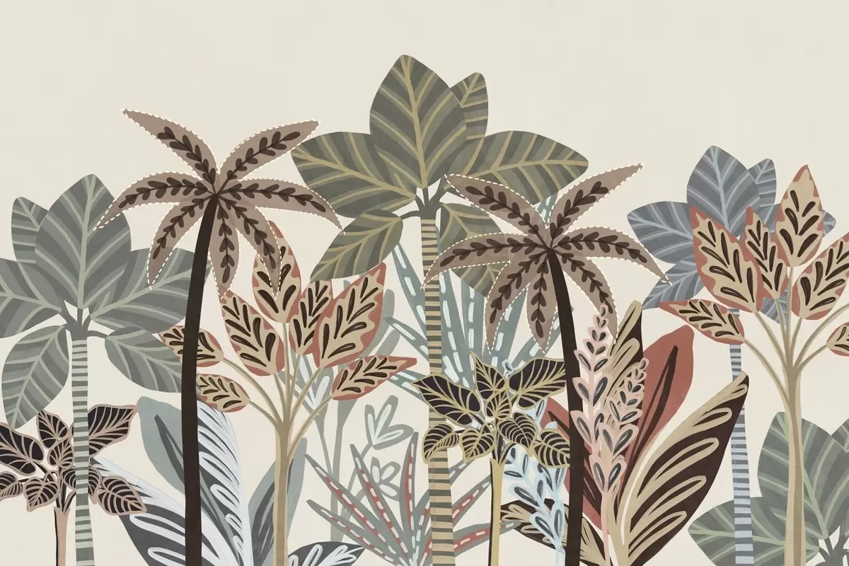Τοιχογραφίες Τροπικά φυτά και φοίνικες με υφή και απαλά χρώματα σε διακοσμητικό στυλ μποέμ, σε κρεμ φόντο. Nr. w09639