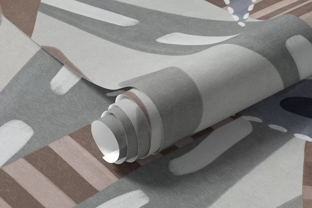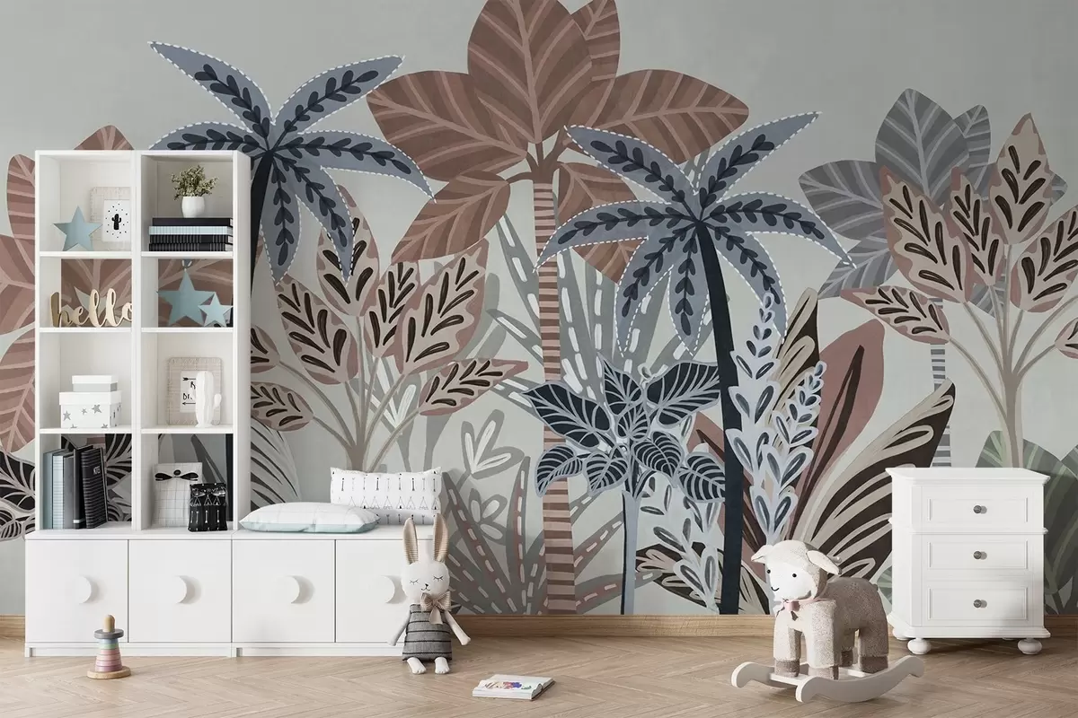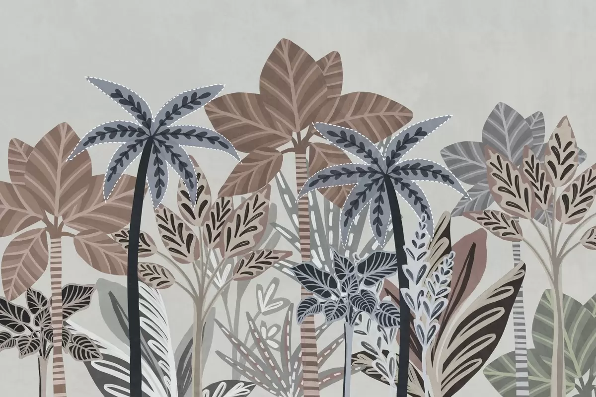 Τοιχογραφίες Τροπικά φυτά και φοίνικες με υφή και απαλά χρώματα σε διακοσμητικό στυλ μποέμ, σε γκρι φόντο Nr. w09639v1