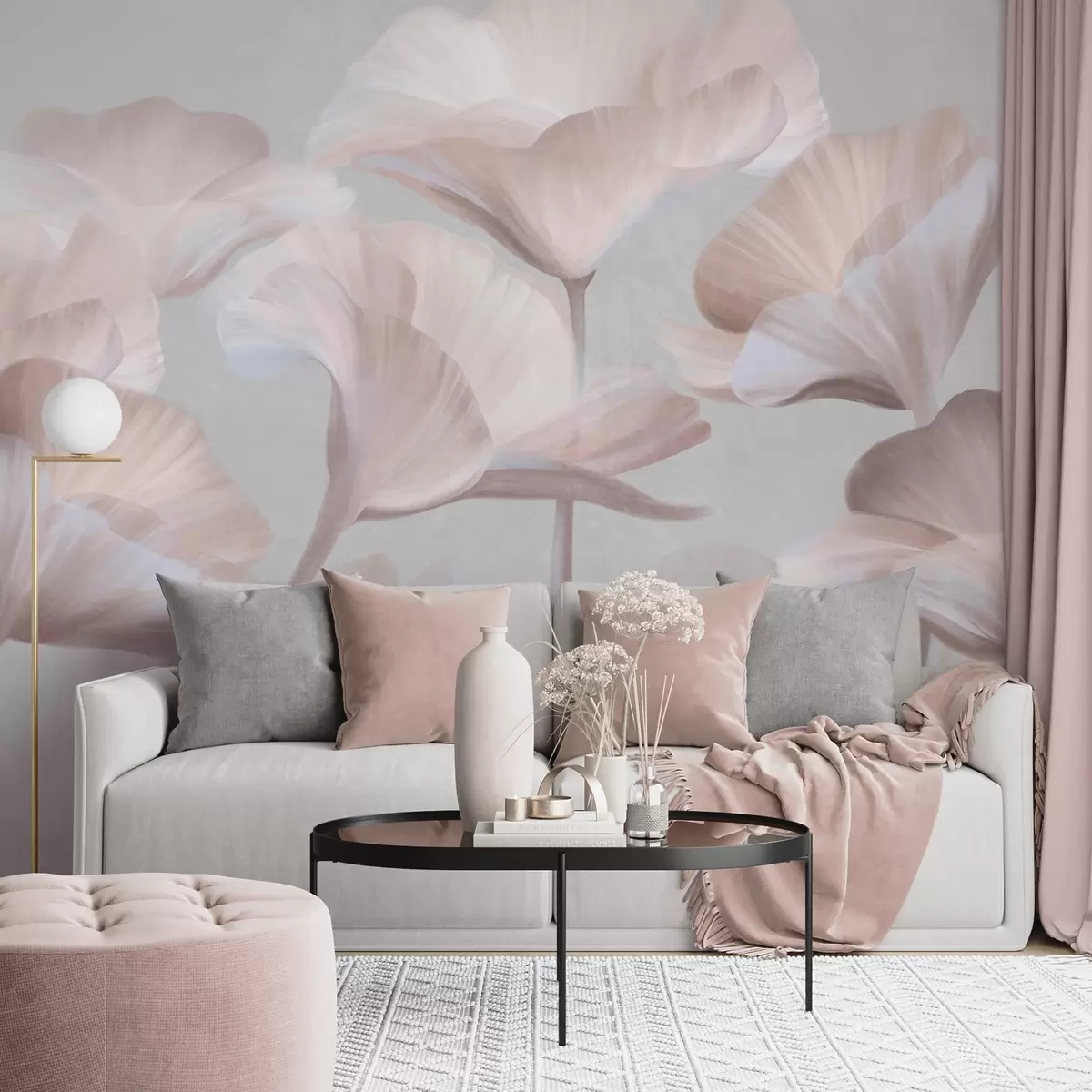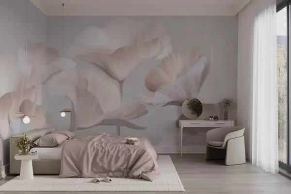 Τοιχογραφίες Ανοιχτόχρωμα ροδακινί, ημιδιαφανή λουλούδια λωτού με λεπτεπίλεπτα πέταλα σε φόντο απαλού γκρι χρώματος. Nr. w09640