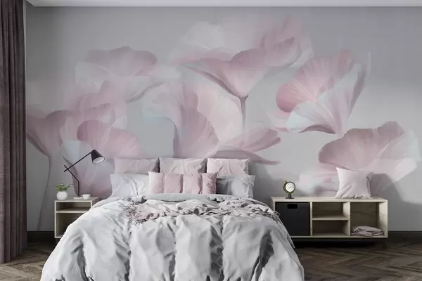 Τοιχογραφίες Ανοιχτό ροζ, διαφανή λουλούδια λωτού με λεπτεπίλεπτα πέταλα σε απαλό γκρι φόντο Nr. w09640v1
