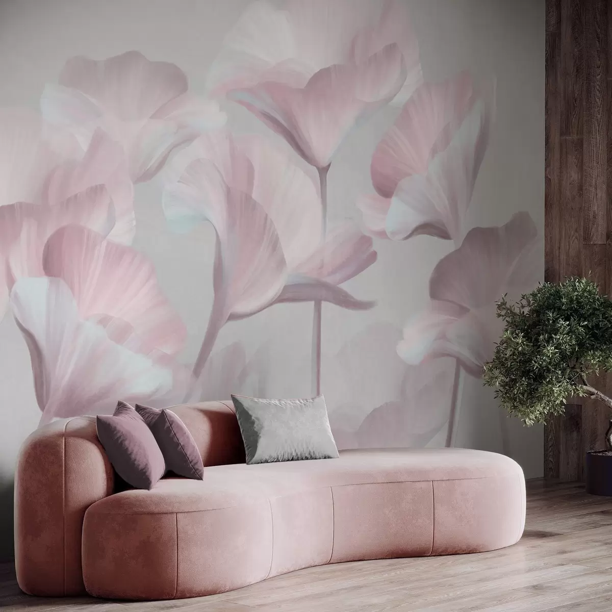 Τοιχογραφίες Ανοιχτό ροζ, διαφανή λουλούδια λωτού με λεπτεπίλεπτα πέταλα σε απαλό γκρι φόντο Nr. w09640v1
