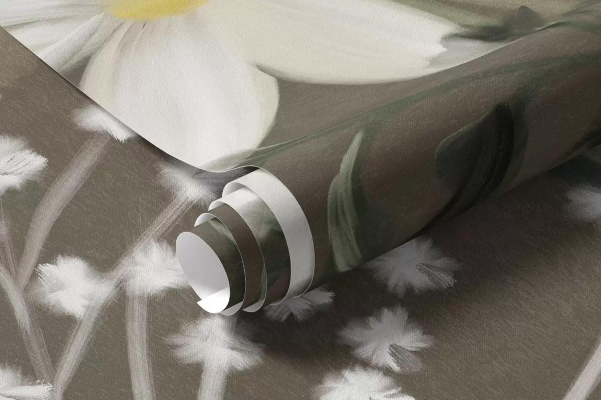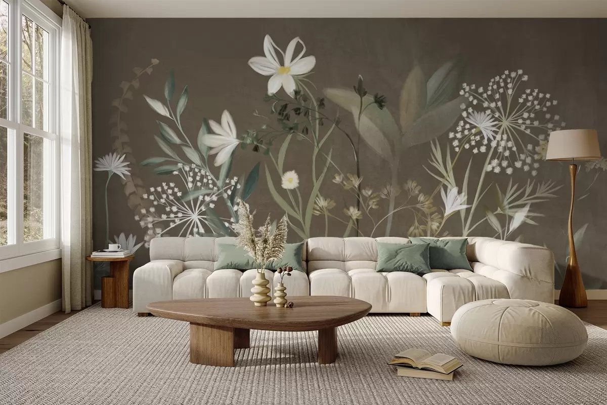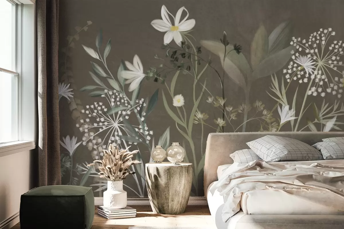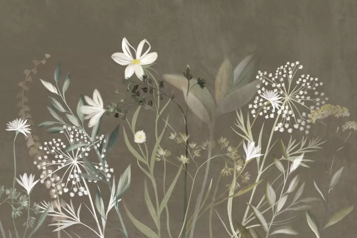 Τοιχογραφίες Λεπτά αγριολούλουδα και φύλλωμα σε απαλούς τόνους του πράσινου και του κρεμ, σε καφέ φόντο. Nr. w09641v1
