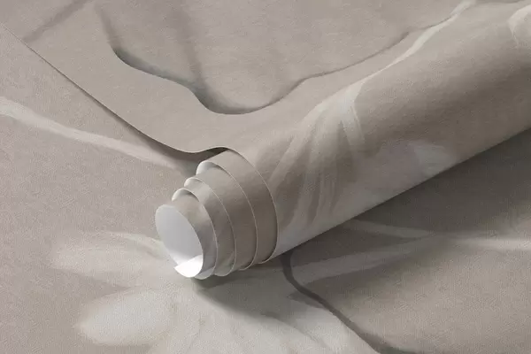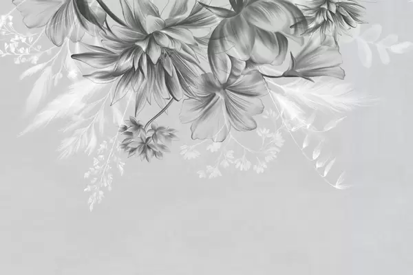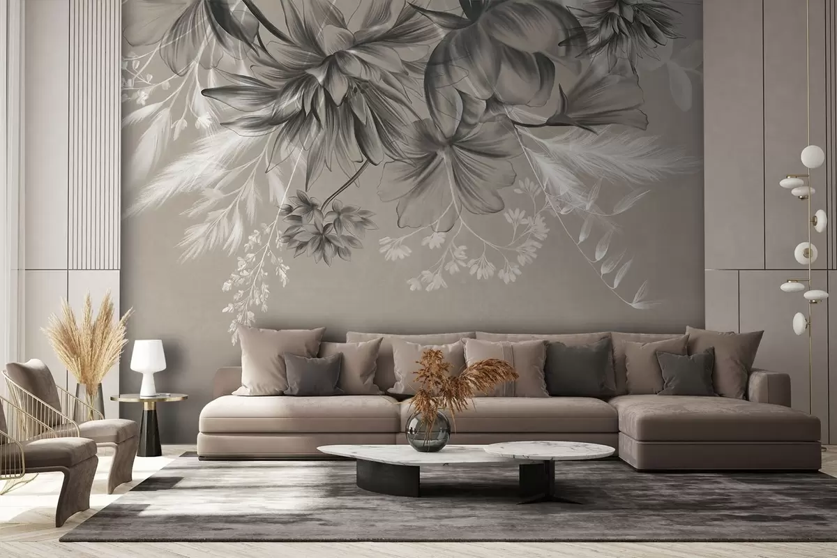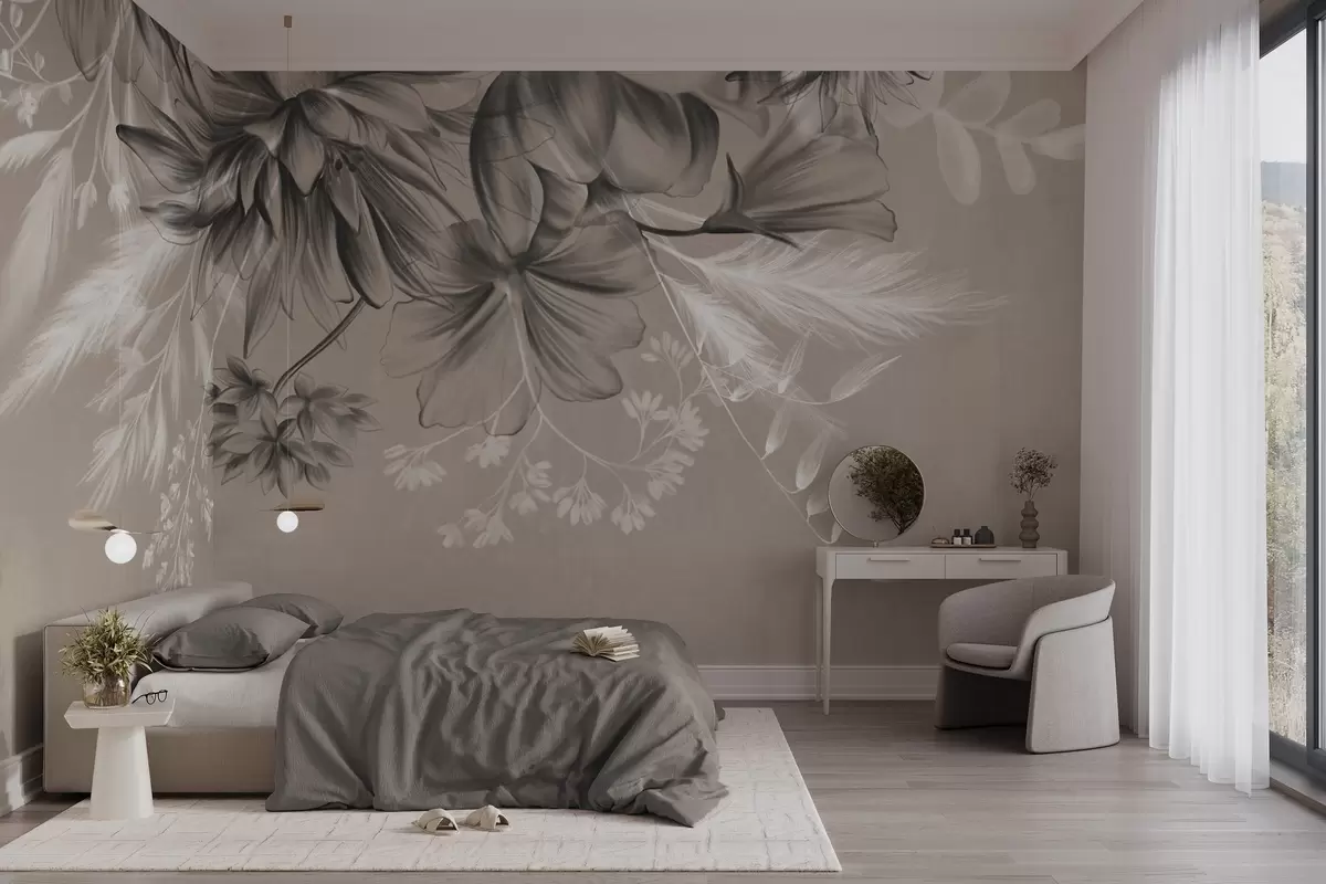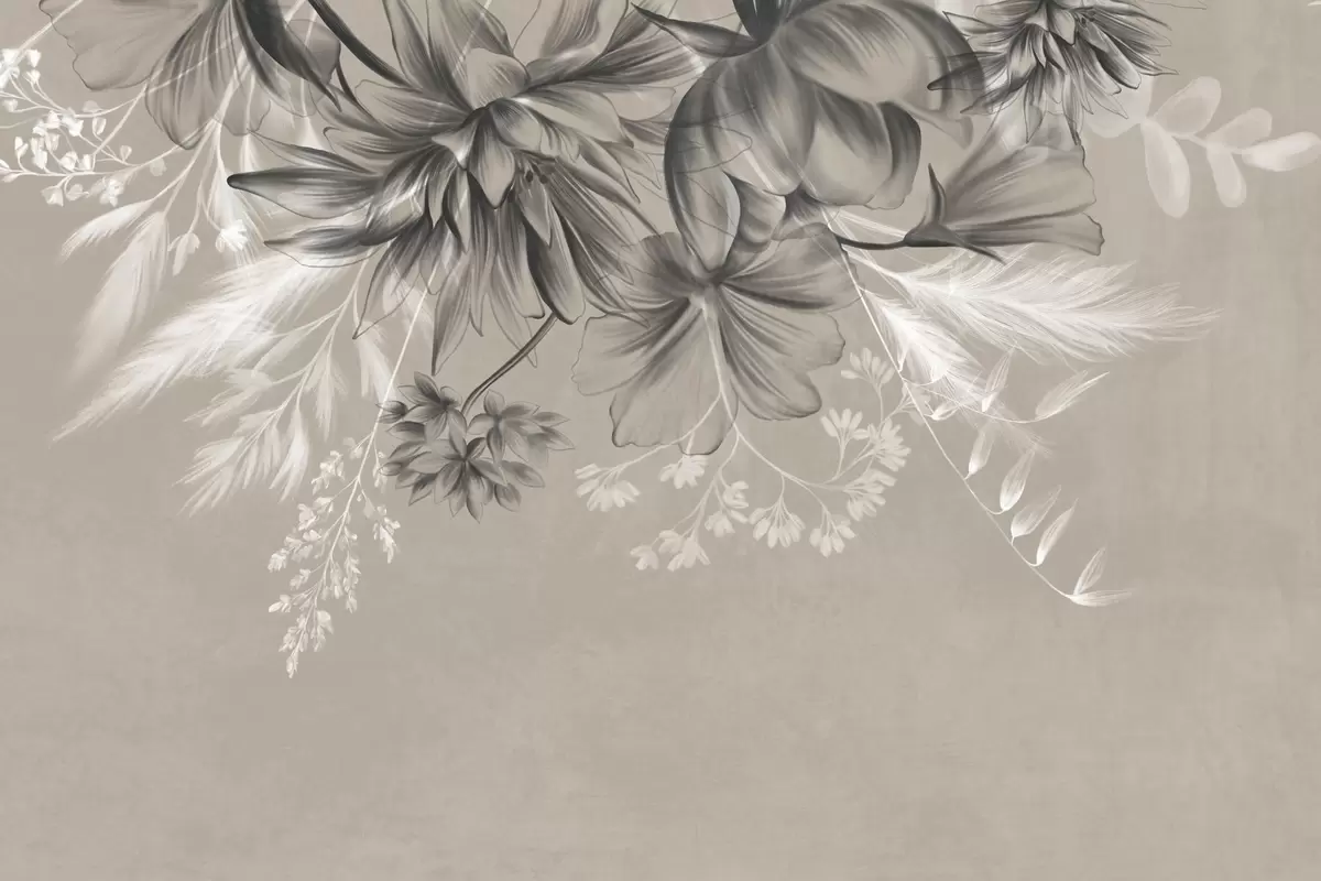Τοιχογραφίες Λουλούδια και φτέρες με υφή σε αποχρώσεις του σκούρου γκρι και του λευκού σε φόντο απαλού μπεζ χρώματος, στυλ σχεδίασης Nr. w09644