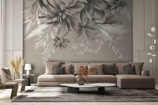 Τοιχογραφίες Λουλούδια και φτέρες με υφή σε αποχρώσεις του σκούρου γκρι και του λευκού σε φόντο απαλού μπεζ χρώματος, στυλ σχεδίασης Nr. w09644
