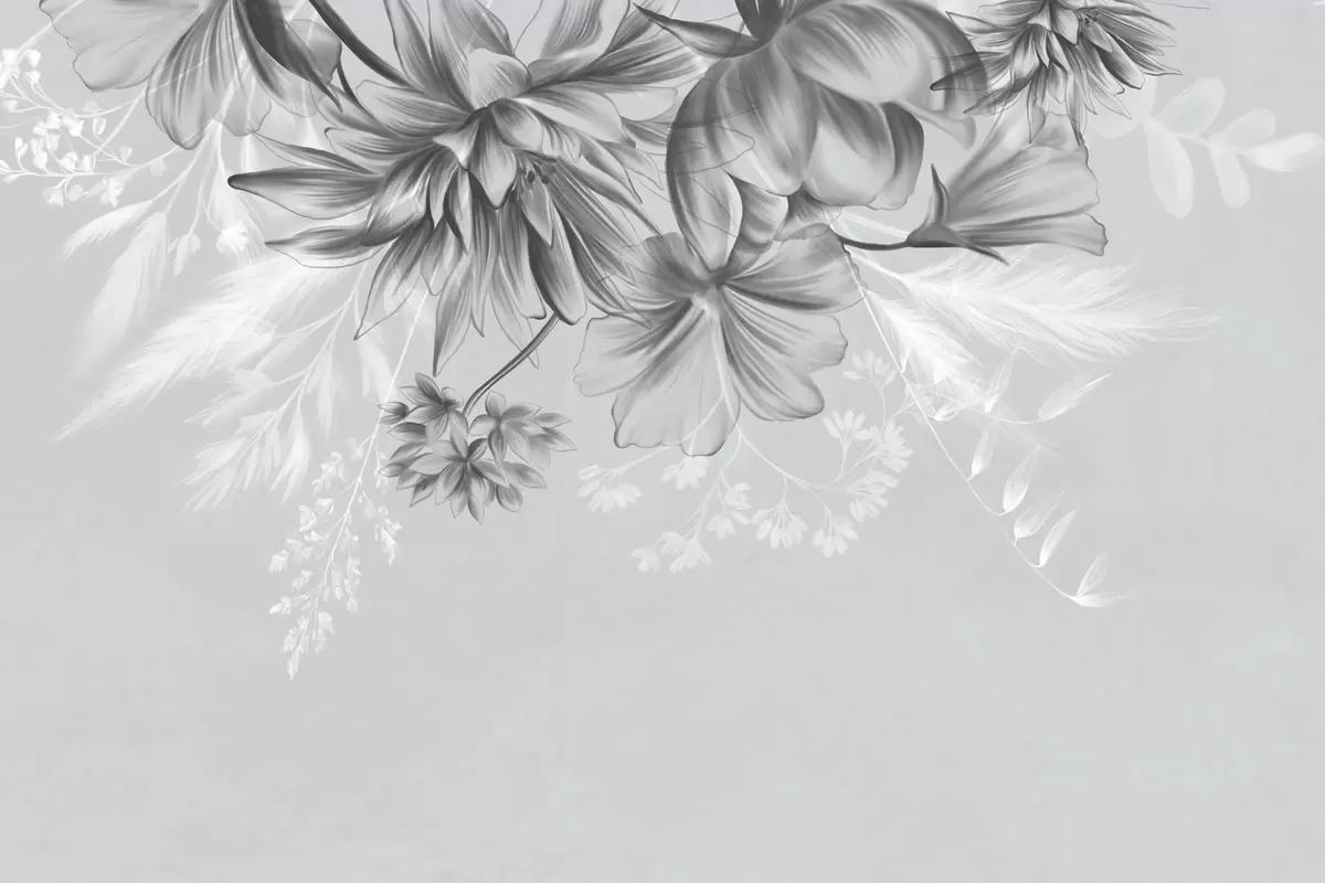 Τοιχογραφίες Λουλούδια και φτέρες με υφή σε αποχρώσεις του σκούρου γκρι και του λευκού σε φόντο απαλού γκρι, σε στυλ σχεδίου. Nr. w09644v1