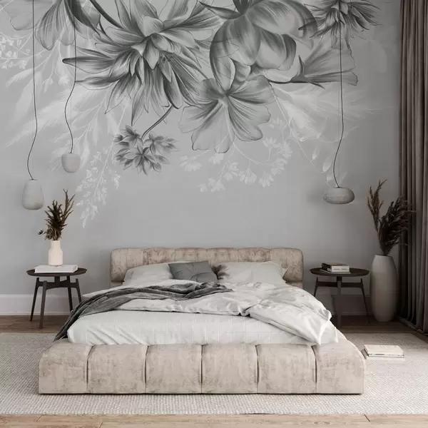 Τοιχογραφίες Λουλούδια και φτέρες με υφή σε αποχρώσεις του σκούρου γκρι και του λευκού σε φόντο απαλού γκρι, σε στυλ σχεδίου. Nr. w09644v1