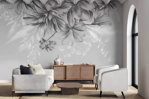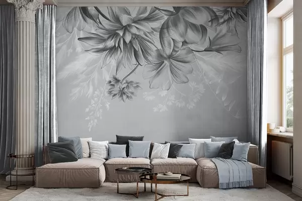 Τοιχογραφίες Λουλούδια και φτέρες με υφή σε αποχρώσεις του σκούρου γκρι και του λευκού σε φόντο απαλού γκρι, σε στυλ σχεδίου. Nr. w09644v1