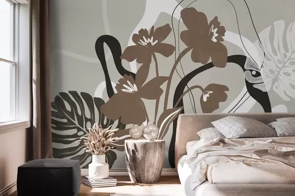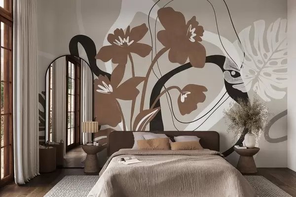 Τοιχογραφίες Αφηρημένα καφέ λουλούδια με λευκά και μαύρα σχήματα σε μπεζ φόντο, μινιμαλιστική τέχνη Nr. w09645v1