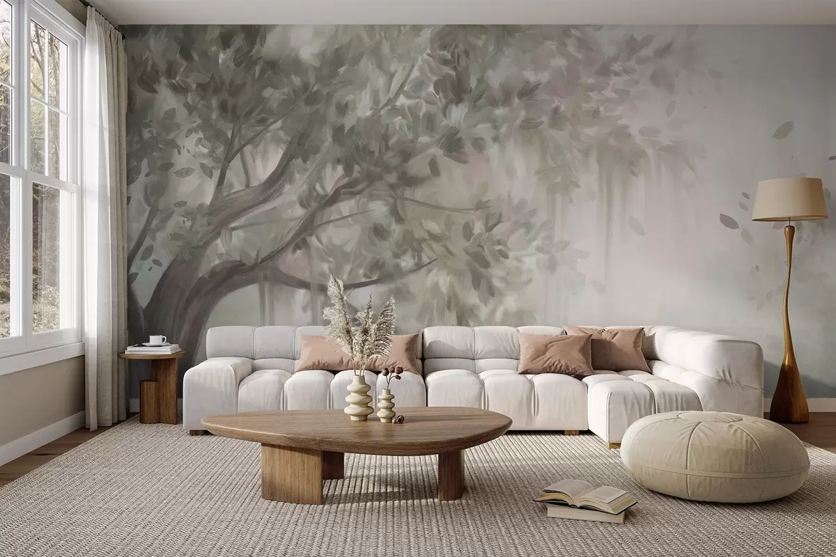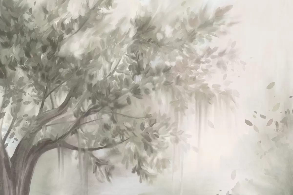 Τοιχογραφίες Δέντρο με υφή, με ανοιχτοπράσινα φύλλα και κλαδιά, με απαλό, θολό φόντο Nr. w09650