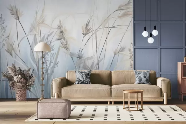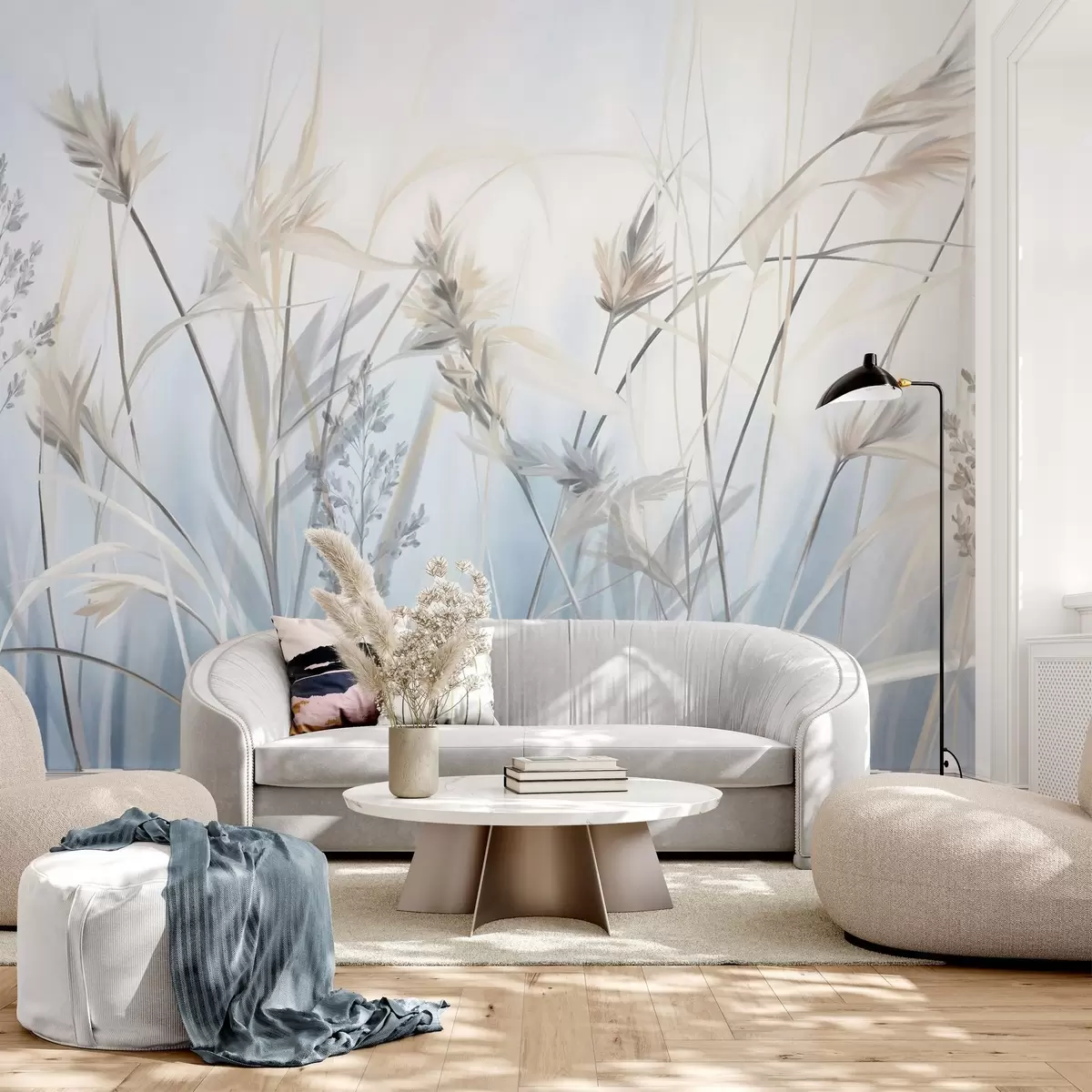 Τοιχογραφίες Ψηλά, ξερά χόρτα με φτερωτές κορυφές σε απαλούς τόνους, απαλό, θολό μπλε και λευκό φόντο Nr. w09652