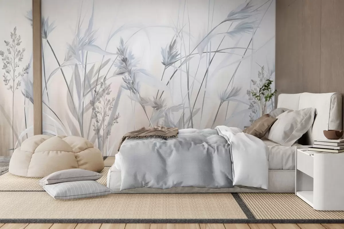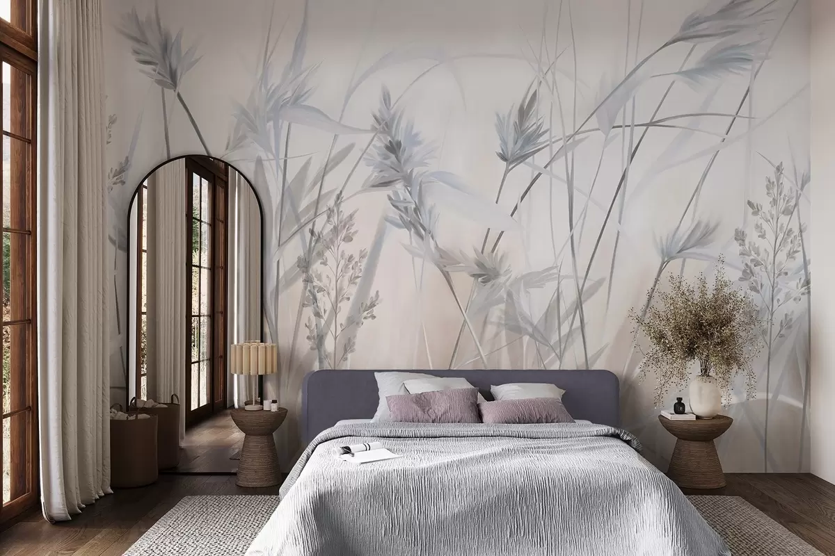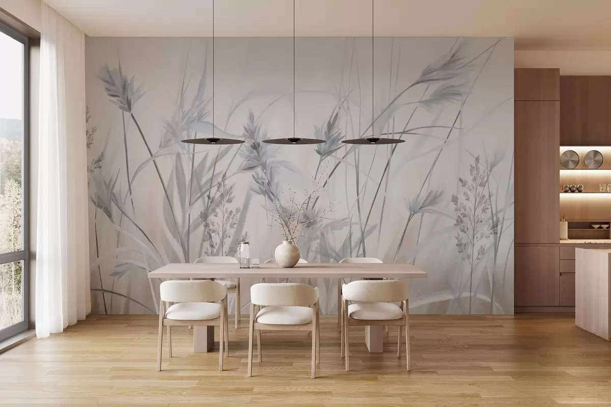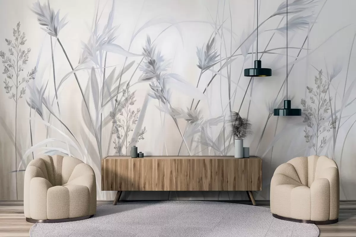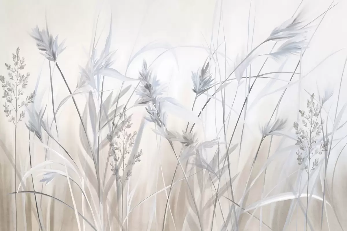 Τοιχογραφίες Ψηλά, ξερά στελέχη χόρτου με φτερωτές κορυφές σε απαλούς τόνους, απαλό, θολό λευκό και μπεζ φόντο Nr. w09652v1