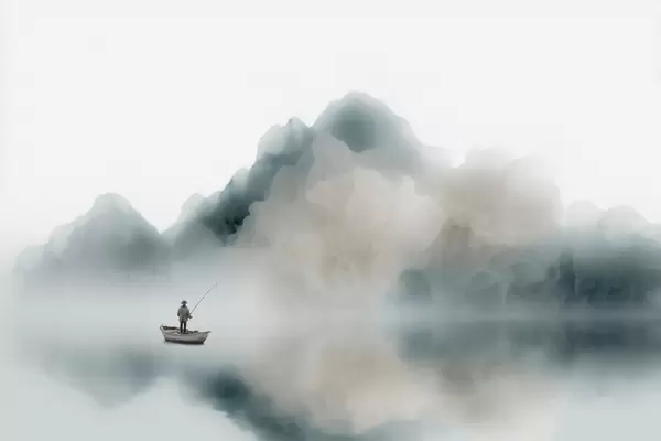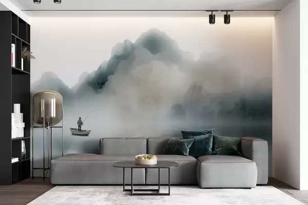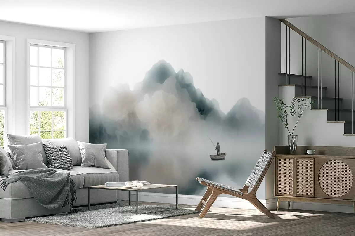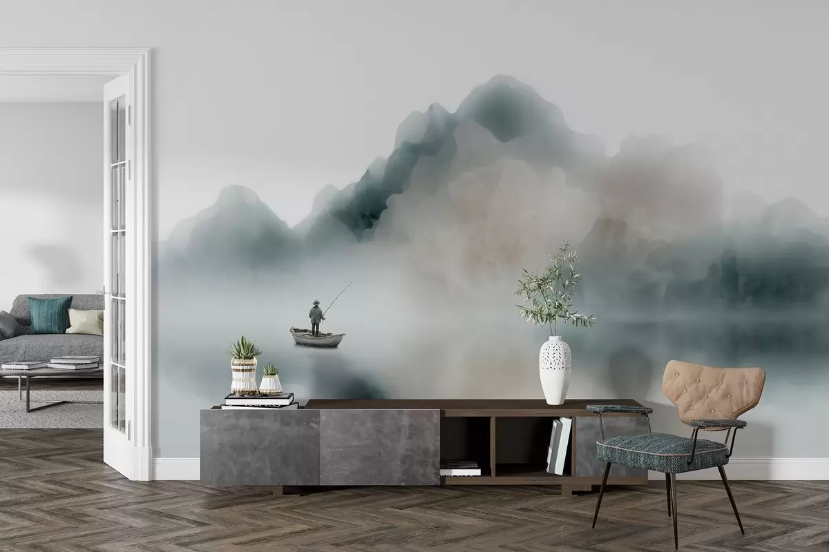 Τοιχογραφίες Ορεινό τοπίο με μια βάρκα και έναν ψαρά που χάνεται μέσα σε μια απαλή ομίχλη Nr. w09678