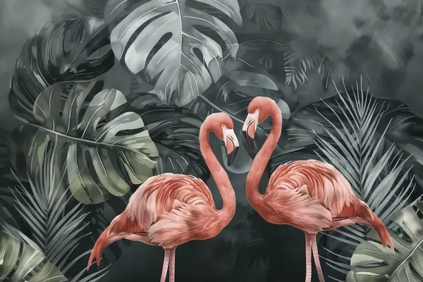 Τοιχογραφίες Ένα ζευγάρι φλαμίνγκο ανάμεσα σε τροπικά φυτά Nr. w09687