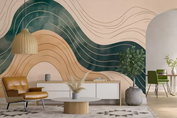 Τοιχογραφίες Αφηρημένες κυματιστές γραμμές σε αποχρώσεις φυσικής άμμου και σμαραγδιού Nr. w09732