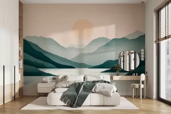 Τοιχογραφίες Ήσυχο ορεινό τοπίο με τον ήλιο πάνω από τη λίμνη Nr. w09735