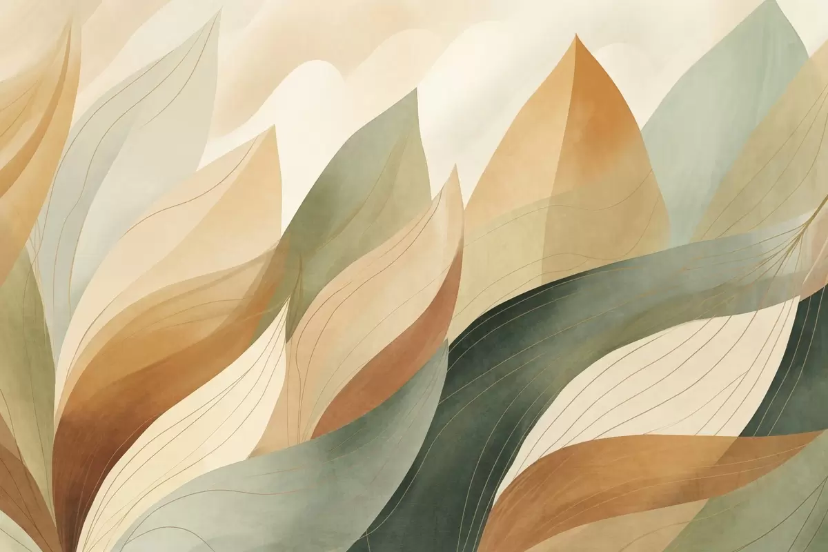 Τοιχογραφίες Αφηρημένα φύλλα, απαλοί γήινοι τόνοι πράσινου, πορτοκαλί με λεπτές λεπτομέρειες γραμμών, απαλή υφή ακουαρέλας Nr. w09736
