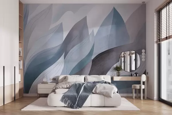 Τοιχογραφίες Αφηρημένα φύλλα, απαλοί γήινοι τόνοι του μπλε με λεπτές λεπτομέρειες γραμμών, απαλή υφή ακουαρέλας Nr. w09736v1
