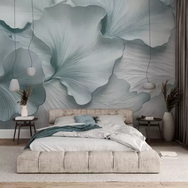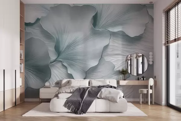Τοιχογραφίες Πετράδια με υφή, μπλε και λευκά πέταλα φύλλων γκίνγκο με λεπτή οργανική εκτύπωση Nr. w09741v1