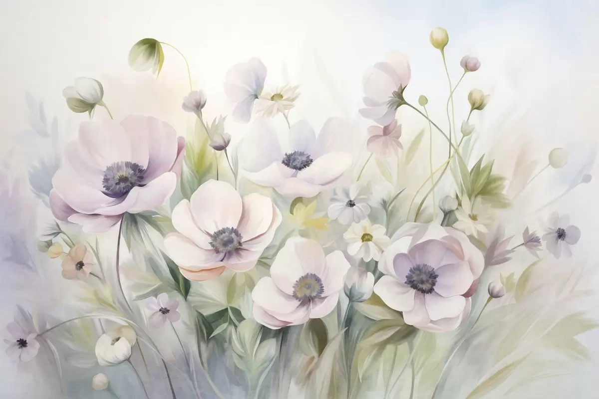 Τοιχογραφίες Ένα λιβάδι με παστέλ ροζ και λευκά άνθη ανεμώνης, πράσινο φύλλωμα και μικρές λευκές μαργαρίτες Nr. w09742