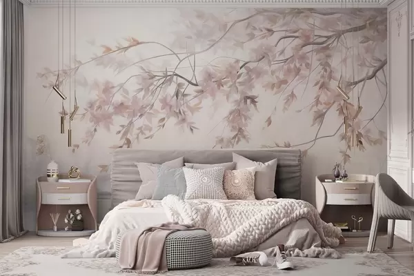 Τοιχογραφίες Υφή τοπίου με κλαδί κερασιάς, ροζ φύλλα, απαλό, ομιχλώδες φόντο Nr. w09743