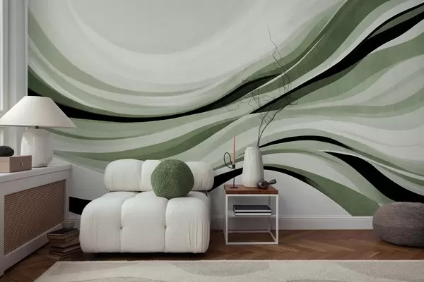 Τοιχογραφίες Αφηρημένες κυματιστές γραμμές σε αποχρώσεις του πράσινου και του μαύρου σε ανοιχτό φόντο, τέχνη με υφή Nr. w09748v1