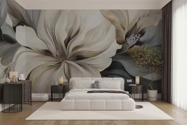 Τοιχογραφίες Μεγάλα, κρεμώδη άνθη μανόλιας με καφέ και γκρι φύλλα, απαλό φωτισμό, αφηρημένο φόντο Nr. w09749