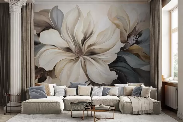 Τοιχογραφίες Μεγάλα, κρεμώδη άνθη μανόλιας με καφέ και γκρι φύλλα, απαλό φωτισμό, αφηρημένο φόντο Nr. w09749