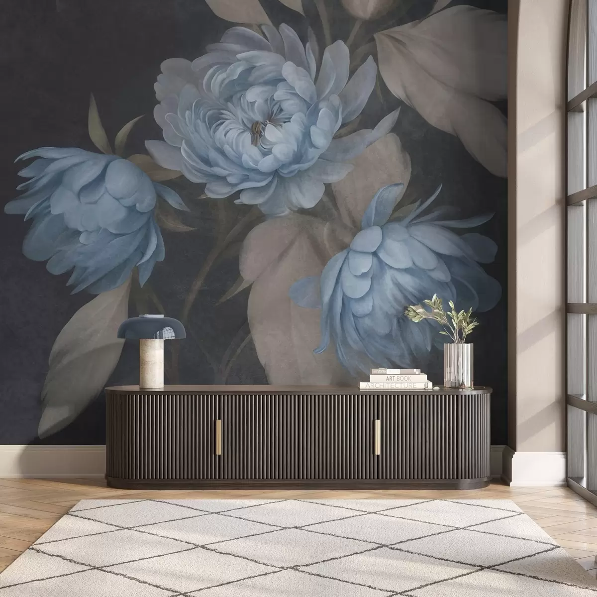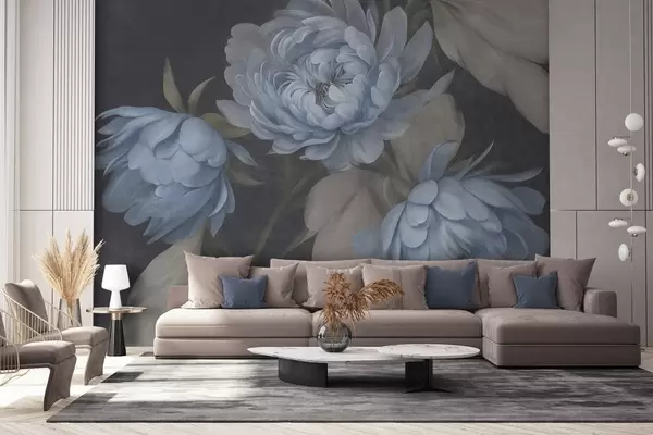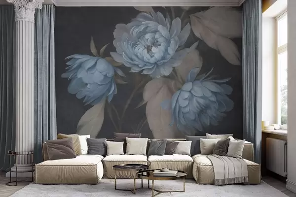 Τοιχογραφίες Ανοιχτό μπλε παιώνιες με ανάγλυφη υφή και μπεζ φύλλα πάνω σε σκούρο φόντο Nr. w09751