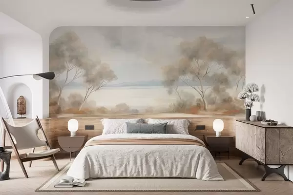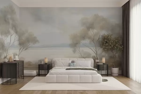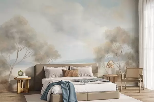 Τοιχογραφίες Ένα τοπίο με υφή ζωγραφικής με δέντρα κάτω από έναν συννεφιασμένο ουρανό Nr. w09753
