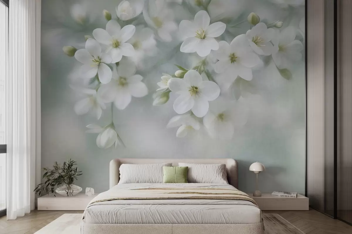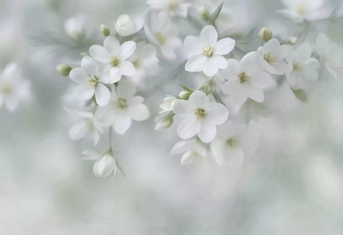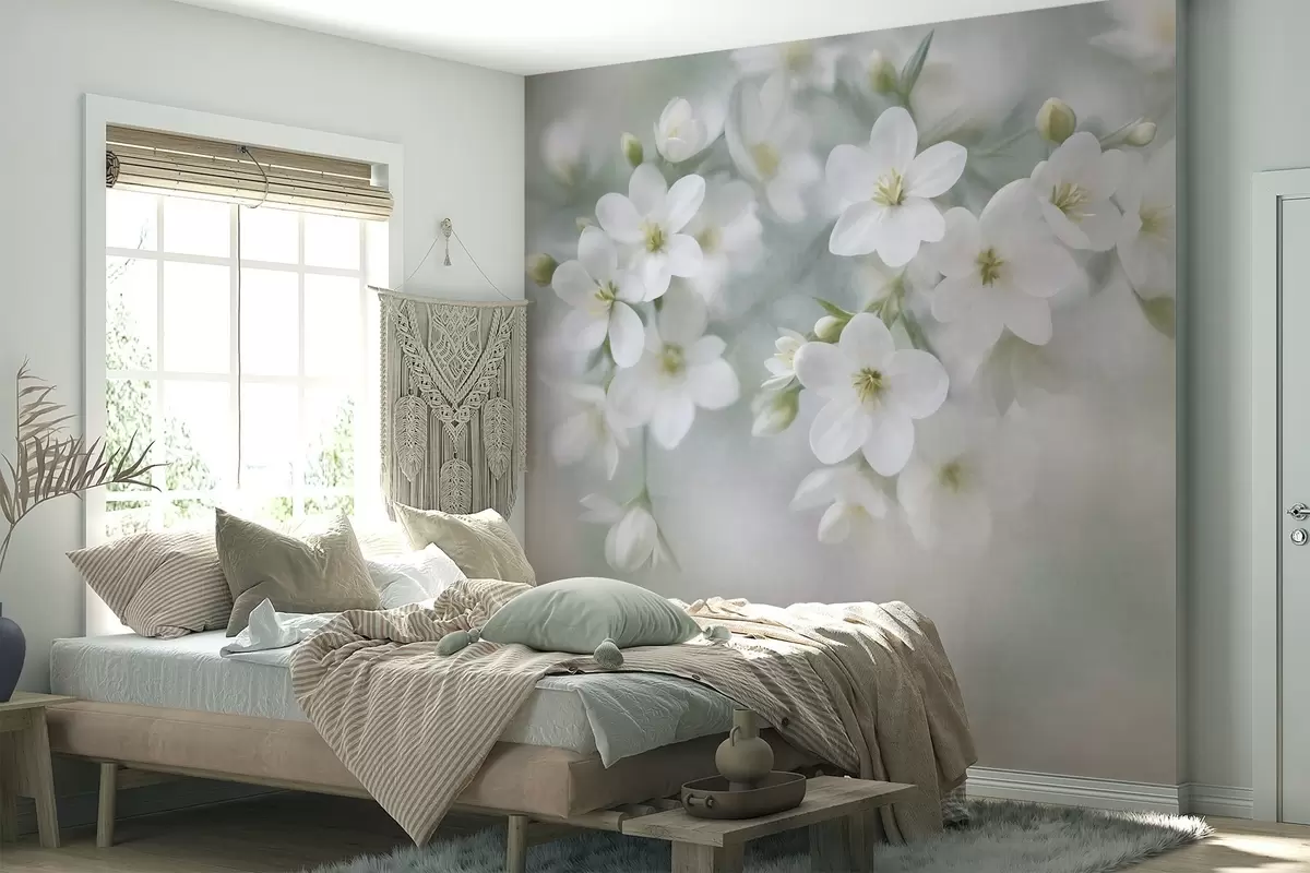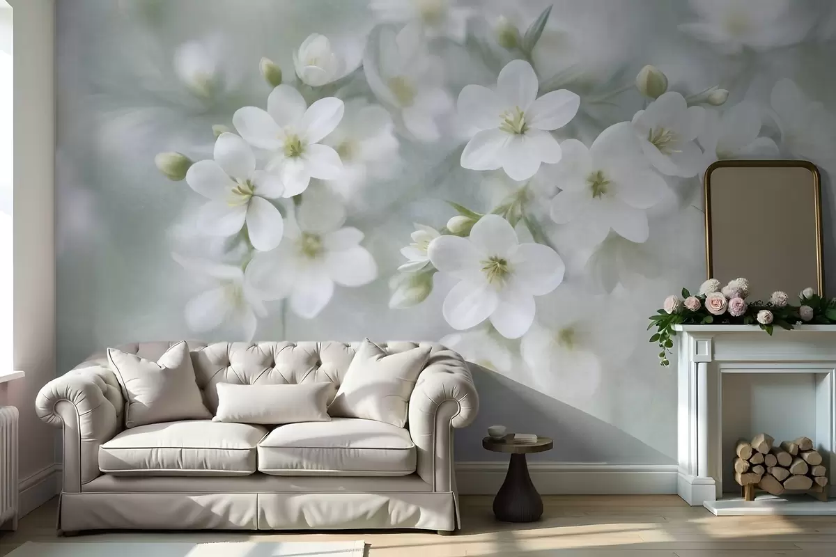 Τοιχογραφίες Λευκά λουλούδια με λεπτή υφή, απαλά θολωμένα στο φόντο Nr. w09759