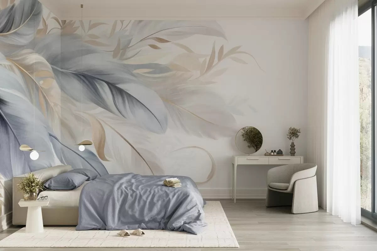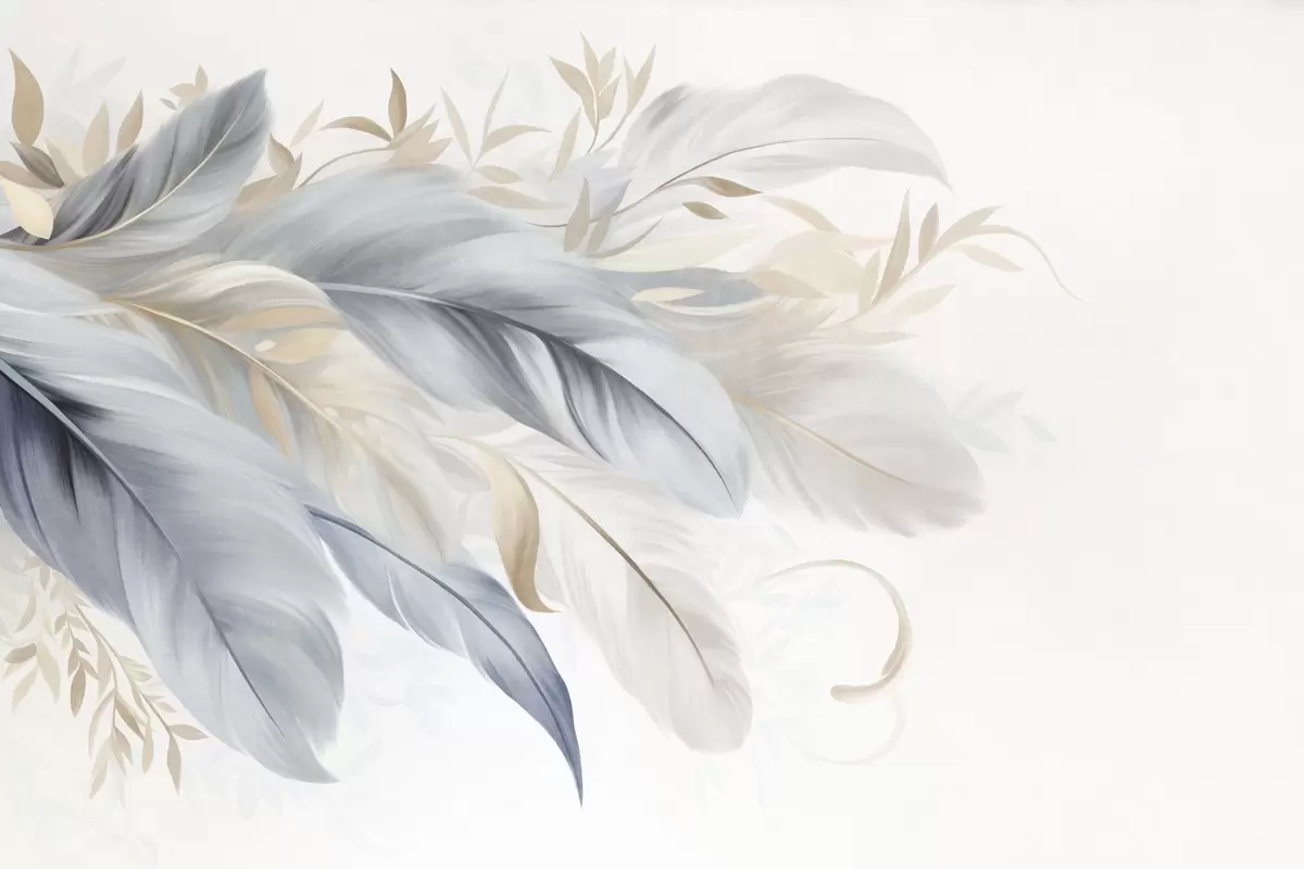 Τοιχογραφίες Φτερά με υφή σε παστέλ αποχρώσεις και λεπτεπίλεπτα φύλλα πάνω σε ανοιχτόχρωμο φόντο Nr. w09763